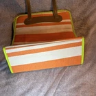 The Neiman Marcus Woven Striped Multicolored White Orange Tote Bag is a stylish and versatile beach bag perfect for women. This large tote features a vibrant orange exterior with white stripes, complemented by brown handles. The bag is made of a bamboo mix material, making it lightweight and durable for carrying essentials to the beach or for casual outings. The hardware color of white adds a chic touch to the overall design, while the orange lining adds a pop of color to the interior. Ideal for those who appreciate a blend of fashion and functionality in their accessories.