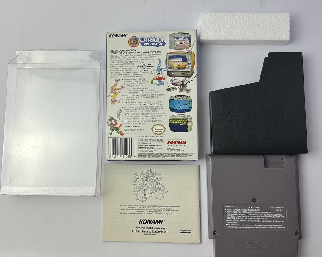 This game comes with the game, box, manual, foam, sleeve and protector. For its age, this isn’t very good condition. This is a NES Tiny Toons Adventures Cartoon Workshop CIB Game Box Foam Manual & Protector Please see all pictures for condition since this is preowned and vintage.