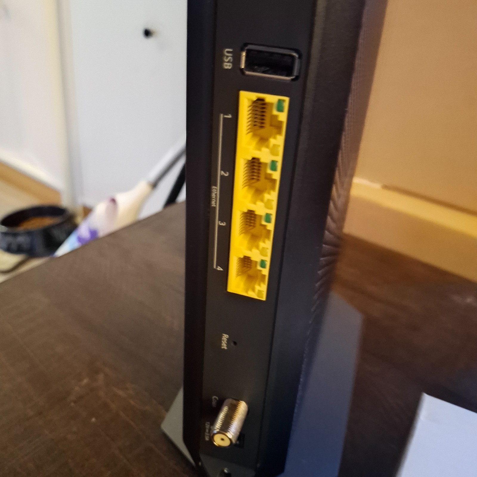 MPN:C7000V2Ports:Ethernet (RJ-45), USB 3.0, USB 2.0To Fit:PCModel:Nighthawk AC1900, NETGEAR Nighthawk AC1900Number of LAN Ports:4Maximum Wireless Data Rate:1900 MbpsColor:BlackMaximum LAN Data Rate:1000 MbpsBrand:NETGEARFeatures:Beamforming, VPN Capabilities, Unlocked, For Gaming, Dual-BandConnectivity:Wireless-Wi-Fi 802.11a, Wireless, Wireless-Wi-Fi 802.11b, Wireless-Wi-Fi 802.11n, USB, Ethernet (RJ-45) Hub/Switch, Wired-Ethernet (RJ-45), Wireless-Wi-Fi 802.11ac, Single Ethernet (RJ-45) Port, Wireless-Wi-Fi 802.11g, Wireless (Wi-Fi)Seller Notes:“refurbished, reset to factory and working with power adapter”Item Height:1.7in.Type:Cable