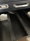 black. The drawers come with a handful of the little dividers. all drawers work and function as they should. The only flaws are some scuffs to the top and sides of the cabinets. There are also some stickers on the front.