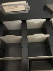 Gray. The drawers come with a handful of the little dividers. all drawers work and function as they should. The only flaws are some scuffs to the top and sides of the cabinets. There are also some stickers on the front.