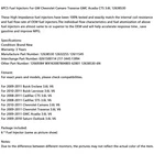 SAFE & SECURE SHOPPING 100% SATISFACTION GUARANTEED FAST SHIPPING Store Categories Store Categories Other eBay Motors Honda Toyota Ford Chevrolet Audi Mercedes-Benz Dodge Jeep You may also like NEW 6xFuel Injectors For GM Chevrolet Camaro Traverse GMC Acadia CTS 3.6L USA Product Description 6PCS Fuel Injectors For GM Chevrolet Camaro Traverse GMC Acadia CTS 3.6L 12638530 These High Impedance fuel injectors have been 100% tested and exactly match the internal coil resistance and fuel flow rate of OEM fuel injectors.The individual flow characteristics and fuel atomization of above fuel injectors are almost same to or superior to the OEM and will help accelerate response time , save gasoline and improve MPG. Specifications: Condition: Brand New Warranty: 3 Years Manufacture Part Number: 12638530 12632255 12611545 Interchange Part Number: 0261500114 217-3445 FJ994 Other Part Number: 12669384 WX163087804803 62801 12638530-6N Fitment: For exact years and models, please check compatibilities. For 2009-2011 Buick Enclave 3.6L V6 For 2010-2011 Buick Lacrosse 3.6L V6 For 2008-2011 Cadillac CTS 3.6L V6 For 2008-2011 Cadillac STS 3.6L V6 For 2010-2011 Chevrolet Camaro 3.6L V6 For 2009-2011 Chevrolet Traverse 3.6L V6 For 2009-2011 GMC Acadia 3.6L V6 For 2009-2010 Saturn Outlook 3.6L V6 Package included: 6 * Fuel Injector (same as picture show) Notes: Due to the difference between different monitors, the pictures may not reflect the actual color of the item. About Us Shipping Terms Returns Contact Us About Us VIPIH is one of the international leading distributors specialized in distribution of auto spare parts of the world’s prime auto part suppliers on a global scale with the full responsibility in procurement, shipping, sales and marketing and after sales service. VIPIH fulfills all needs of its clients completely and on a timely basis with the know-how it has built up since it was established and the comprehension knowledge of the sectors standards. The perfectionist approach in product quality, high service availability, strict principle of business follow-up, reliability and the good reputation which has gained strength as a result of customer satisfaction are the most striking components of VIPIH ’ s success. VIPIH is presently capable of supplying all demands for auto parts from the gear box to turbo hoses in a wide range. Free delivery with worldwide shipping options available. If can not locate what you need then please get in touch! Shipping United States Buyers Parcel will via USPS or UPS from us United States warehouse Shipping Time Usually ,Parcel will be delivered 2-7 working day include Handling time. Sometimes shiping time may has a little delay, such as Bad wether,Holidays Terms We stand behind everything that we sell and will do everything possible to assure you are satisfied. When you receive your purchase if you are not 100% satisfied, please sent me ebay message and we will do our best to make you happy. If you still want to return your purchase, simply ship the item(s) back to us and we will refund your original purchase price and the original shipping charge. Buyers are responsible for the postal cost of returning the items. We must be notified of the intent to return your item within 30 days of receiving the item. Items returned must be in the same condition that they were received. How to return 1,Please ask us for return address . 2,Shipping back the package . The RMA#(Return Merchant Authorization Number = Your ebay ID) must be clearly written on the return package ,Otherwise the package will be refused. 3,Sent us the return tracking number. 4,All returns will be inspected prior to a credit being issued. Returns 1:Returns are accepted within 60 days of purchase. 2:All returned items MUST BE in the original packaging. 3:We will be happy to assist you if if any item needs to be returned or replaced 4:Please don't open a return request before contacting us first to solve, many thanks. Contact Us If you have any questions, our Customer Service staffs welcome you to sent me ebay message. We strive to answer all questions and resolve any problems as quickly as possible. Business Hours: Monday-Saturday 9:00-17:00 Copyright © 2022 Tongtool