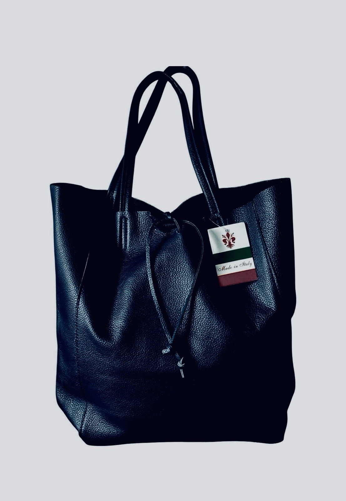 This new Italian leather tote bag by Florence features a classic rectangular shape with a drawstring closure and shoulder strap handle style. The bag is made of blue leather with inner pockets and a zipper pouch for added convenience. With a coin purse accessory included, this stylish and practical tote is perfect for any woman looking for a sophisticated Italian-themed handbag. Made in Italy, this bag exudes quality and craftsmanship, making it a standout addition to any wardrobe.