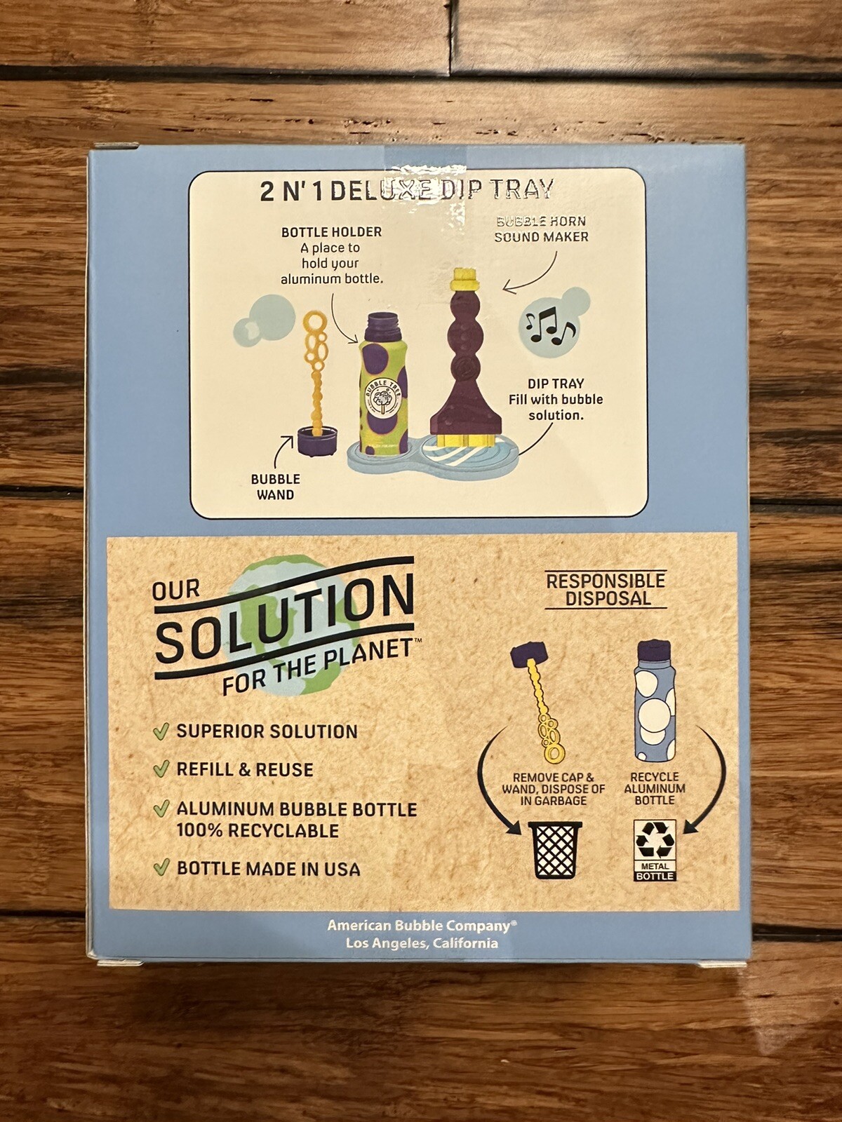 • 1-4 fl. oz. prefilled bubble bottle made from 100% recyclable aluminum that can be refilled. • Custom design wand affixed to cap of aluminum bottle. • 2 N’ 1 deluxe dip tray. Provides 1 space to hold aluminum bubble bottle and another space to hold bubble solution and sound maker bubble flute. • Sound maker bubble flute blows bubbles and makes sound at the same time. • Age grade 3+