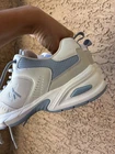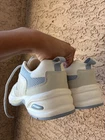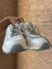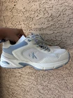 The product is a pair of Calvin Klein ivory neutral beige sneakers in women's size 7,5. These athletic sneakers feature a classic style with lace closure and a cashmere upper material. The Calvin Klein brand adds a touch of luxury and designer flair to the timeless sneaker design, making them a stylish and versatile choice for any woman's wardrobe.
