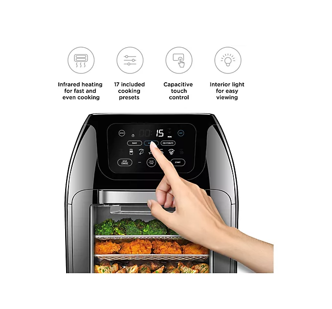 Do it all with this digital air fryer and rotisserie oven. Make juicy rotisserie meats, healthy meals, fruit snacks for the kids, or convection-cook dinners. From Chefman. Includes RJ38-10-RDO-V2 air fryer/rotisserie and accessories 1700 watts Multifunctional, programmable 17 touch screen presents to fry, roast, dehydrate, and bake Auto shutoff Extra large, 10L family size Measures 12.2" x 11.81" x 14.56" Hand wash; stainless steel acces