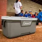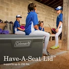 Icy beverages and shared meals fuel the best times outdoors, and the 316 Series Cooler is the right choice for the job. This large 120-quart chest holds up to 102 cans and 60 lbs. of ice, enough to refresh the entire gang. Looking for multiday ice retention? TempLock FX insulation in the lid and body has you covered. And, the 316 Series is made with 15% less plastic than comparable Coleman coolers. Built to last, the Have-A-Seat Lid supports up to 250 lbs., has four cup holders, and is recessed for easy access. Want more? The tethered drainplug resists leaks, the liner resists stains, and our EZ-Clean top makes cleanup simple. Modern color combo has updated appeal, and there's even a built-in ruler for measuring the catch of the day. From campsite to worksite, beach to bonfire, soccer field to stadium–Coleman helps you keep your cool. Coleman Cooler, 316 Series, 120-Quart Chest KEEP IT COLD: Fully insulated lid and body with TempLock FX for multiday ice retention UPGRADE: The 316 Series is made with 15% less plastic than comparable Coleman coolers LOSE THE LEAKS: Tethered drainplug resists leaks and won't get lost GRAB & GO: Easy-grip handles are now more durable than ever ENJOY A BIG SIP: Four cup holders prevent spills; each holds up to a 30 oz. tumbler TAKE A LOAD OFF: Sturdy Have-A-Seat Lid supports up to 250 lbs. CLEAN UP QUICK: Stain-resistant liner & the EZ-Clean lid make cleanup a breeze GO BIG: 120-quart size holds up to 102 cans and 60 lbs. of ice