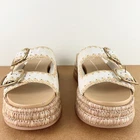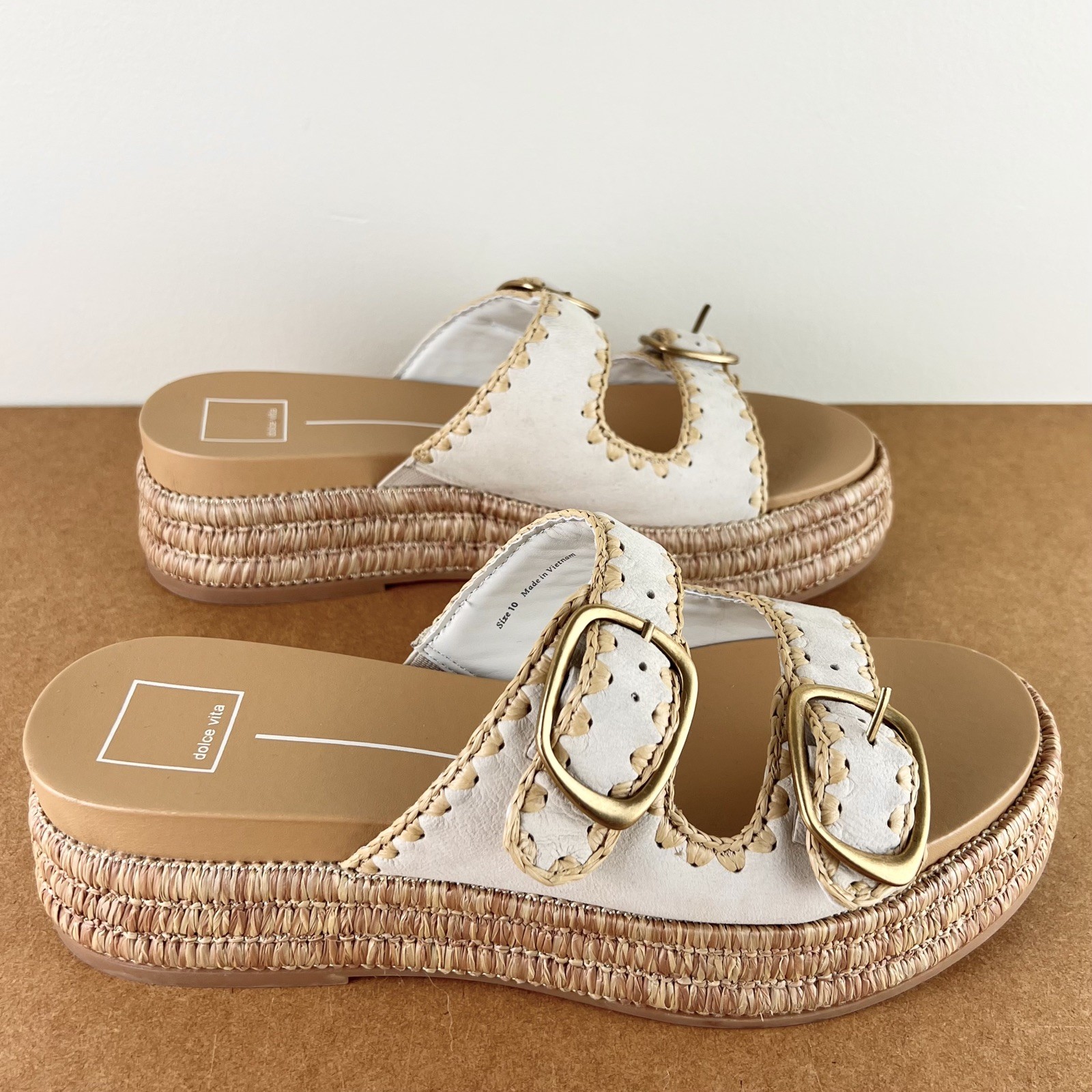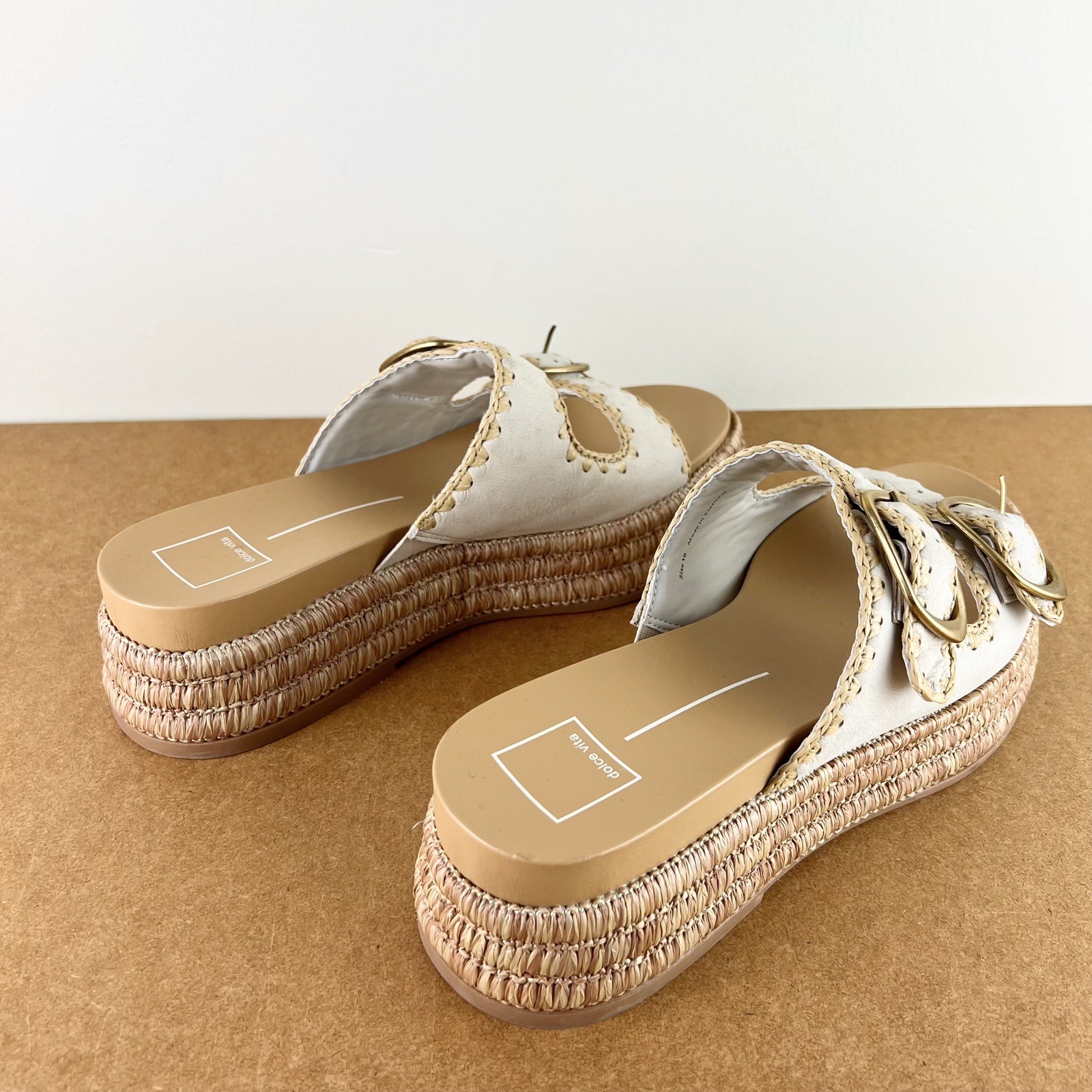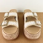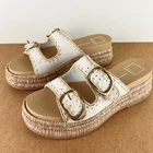 NEW DOLCE VITA BEIGE ESPADRILLE PLATFORM SANDALS 10 NEW WITHOUT BOX *store try-on pair; has some scuffs/scratches/creasing/marks* SIZE- 10 DETAIL: - Open round toe - Buckle close double vamp straps COLOR- sand nubuck MATERIAL- leather/jute upper; manmade lining; rubber sole