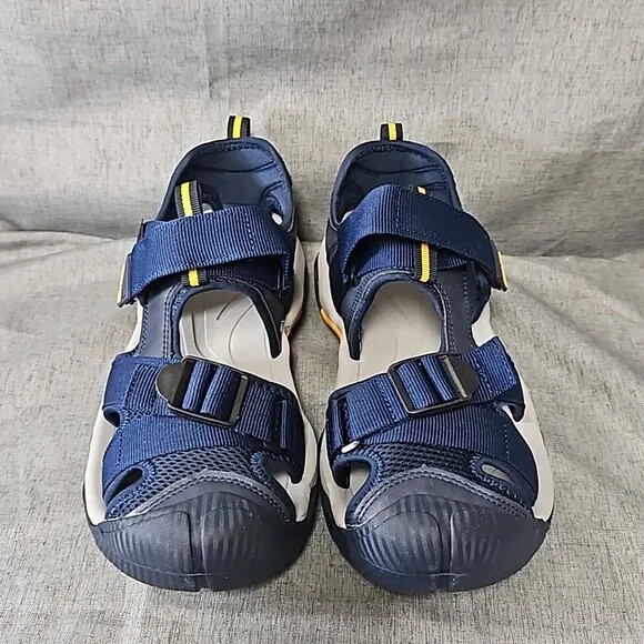 This is a new pair of Dream Pairs men's sport outdoor sandals in navy, size 9. They feature a hook & loop closure, a flat heel, and a fisherman style. These lightweight and comfortable sandals are suitable for summer activities and are made with synthetic materials. The design includes accents of hook & loop and buckle details, with a solid blue color. Perfect for hiking or water sports, these sandals are part of the Dream Pairs product line. Shoes are new in box and never worn. Box has defect on top, but it did not affect the product.