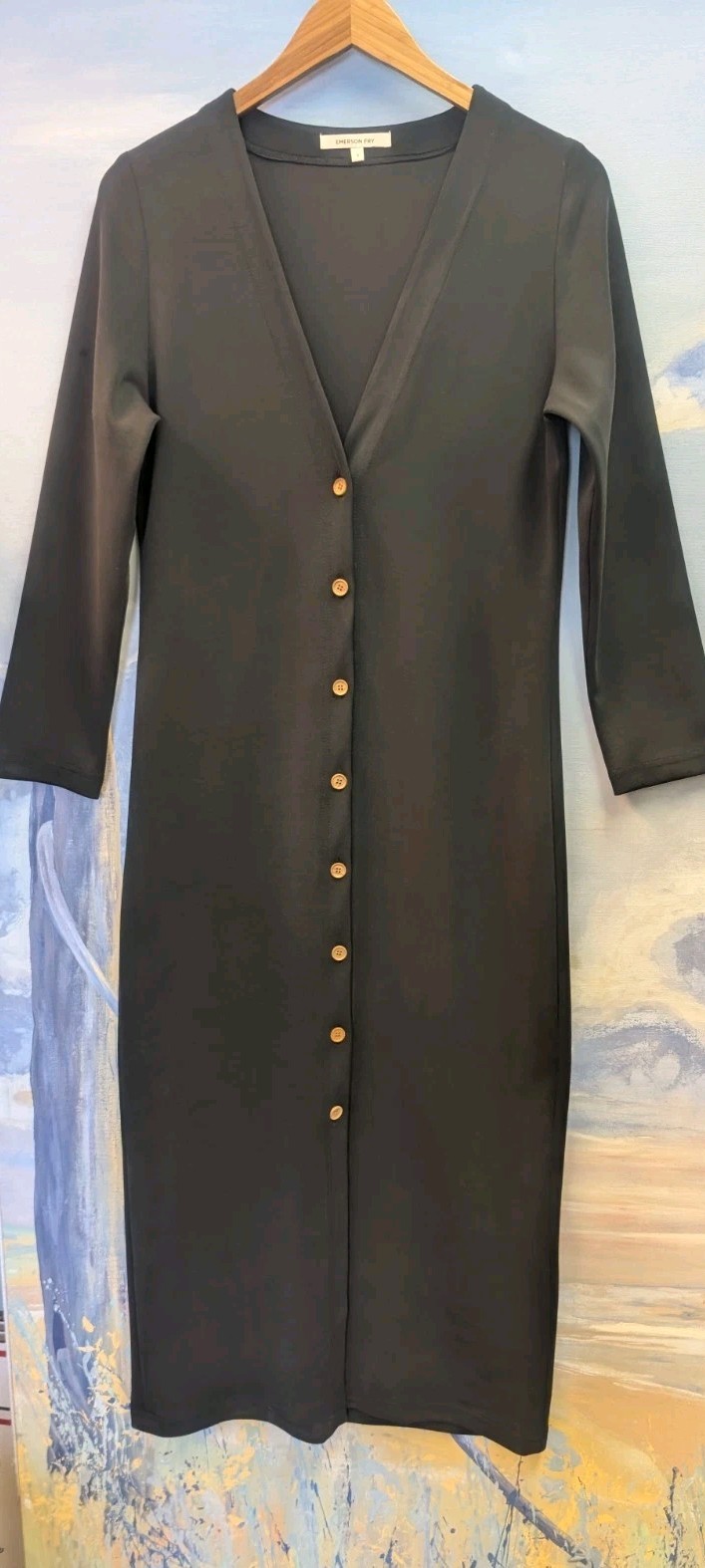 The Emerson Fry S Long V Neck Stretch Column Dress is a versatile and stylish piece perfect for various occasions including travel, parties, casual wear, and more. Made from a blend of Tencel, Polyester, and Spandex, this dress offers a comfortable and stretchy fit. The long sleeves, V-neckline, and button accents add a touch of sophistication to the design. This black dress with a solid pattern and jersey fabric type is a timeless addition to any woman's wardrobe, suitable for all seasons. Made in the United States by the brand EMERSON FRY, this dress is sure to make a statement.