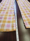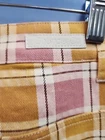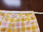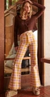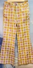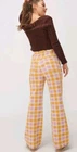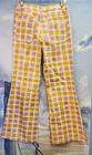 This is a pair of new Ghanda high-rise wide-leg pants in size 12. Made from cotton and spandex with a multicolor plaid pattern, these pants feature a zip and button closure, a flat front, and a 30-inch inseam. They have a bohemian theme and are suitable for occasions like travel, parties, or casual wear. The pants also include stretch fabric, pockets, and are machine washable, making them versatile and comfortable for various seasons.