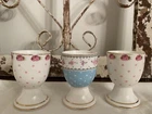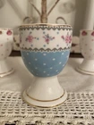 NEW GRACE TEAWARE VICTORIAN WHITE PINK BLUE ROSES EGG CUP HOLDER STAND 3 PC SET. Beautiful condition, no chips or cracks.