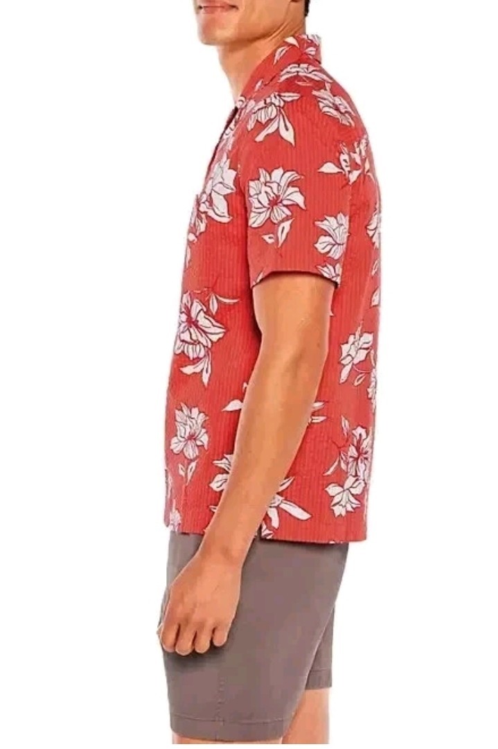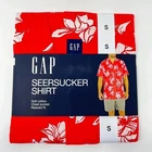 The Gap Men's Short Sleeve Seersucker Vacay Shirt in size Small features a vibrant Cayenne color with a floral pattern, perfect for a casual yet stylish look. Made with a lightweight and breathable fabric, this relaxed fit shirt is machine washable for easy care. The collared neckline and button closure add a touch of sophistication to this button-up shirt, making it a versatile addition to any man's wardrobe. Made in Vietnam, this shirt combines quality craftsmanship with a fun and trendy design.