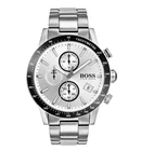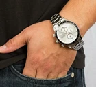 Japanese Made Quartz Chronograph Movement. Running Seconds. 30 Minute Counter. 24 Hour Indicator. Date. 44mm Stainless Steel Case. Scratch Resistant Mineral Crystal. Tachymeter Bezel. Silver Dial. Luminous Steel Hands. Stainless Steel Stick Indexes. Date Window at 4. Stainless Steel Bracelet with Stainless Steel Push Button Deployment Clasp. Water Resistant to 50 Meters 5 ATM