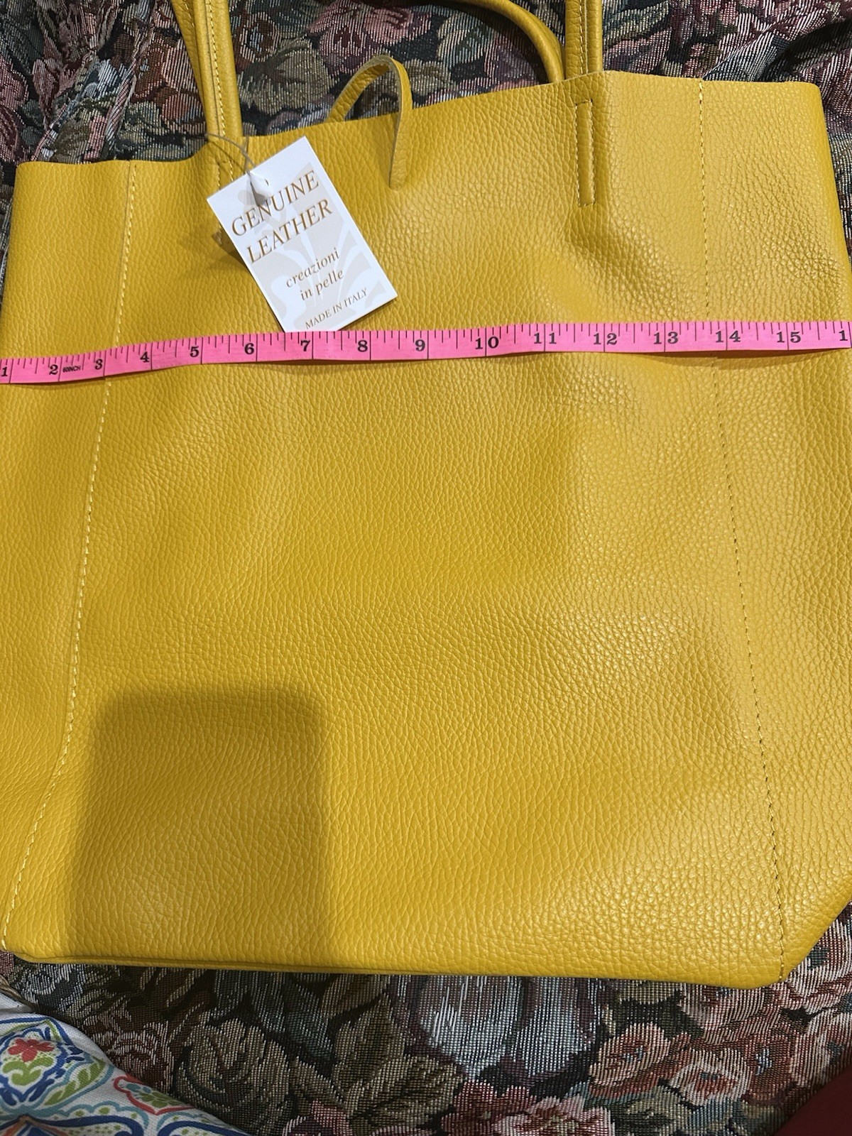This NEW Italian Leather Tote Bag features a solid yellow exterior with a drawstring closure and yellow leather handles. The bag includes an inner zipper pouch and a coin purse, making it practical for everyday use. With a classic rectangular shape and leather lining, this stylish tote exudes an Italian theme, perfect for adding a touch of luxury to any outfit. Made in Italy as part of the Florence collection, this tote is a must-have accessory for any fashion-forward woman.