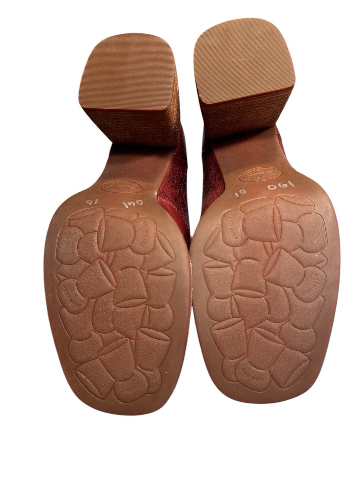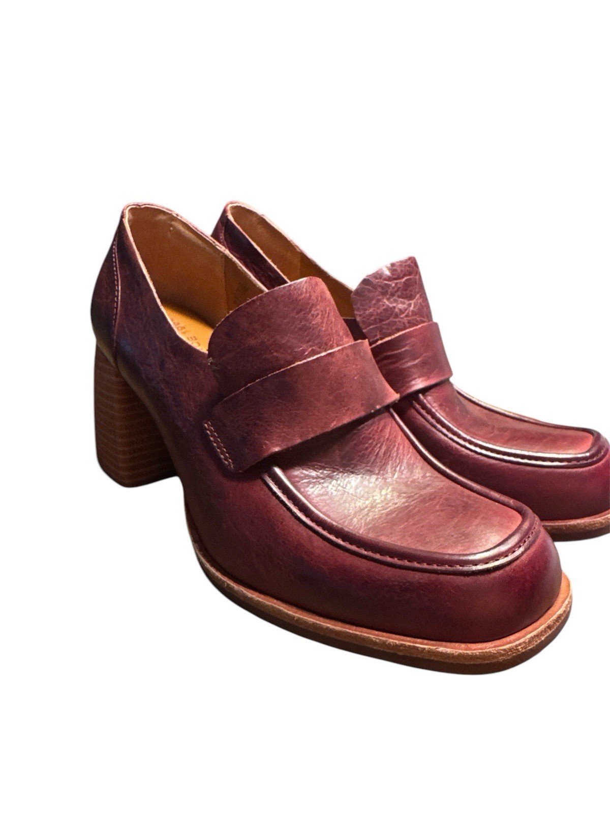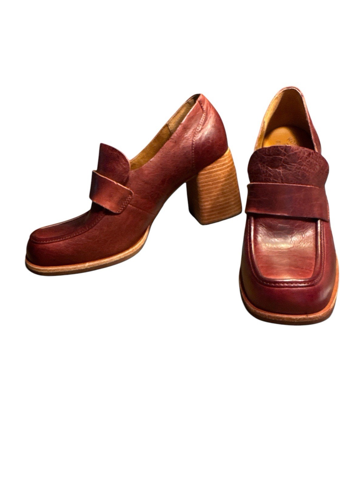 The se stunning Kork-Ease loafers are extremely comfortable. They have a soft micro suede lining with a cushioned foot bed. 3 inch wooden stacked heel. Their official color is “ burgundy port ”.