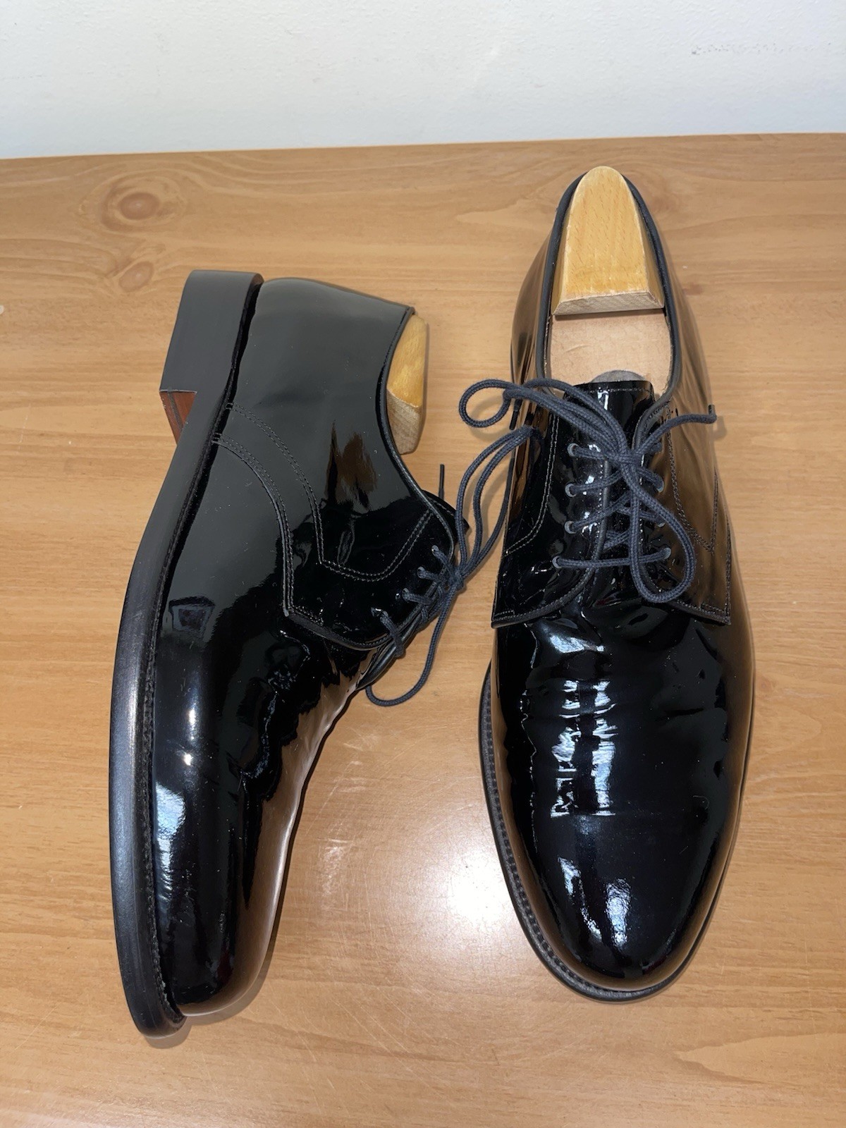 These Land's End men's black patent leather tuxedo shoes in size 9M are a stylish and comfortable choice for any formal occasion. With a classic round toe shape and lace-up closure, these Oxford-style shoes feature a solid black color and are made of high-quality leather both inside and out. Designed for comfort, these dress shoes are perfect for year-round wear and can be easily paired with a tuxedo or a dressier outfit for a sophisticated look. Made in Brazil, these shoes are a timeless addition to any man's wardrobe. New without box. Shipped with USPS ground advantage.