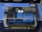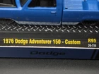 This is a 1:64 scale diecast model of a 1976 Dodge Adventurer 150 truck in custom blue color from M2 Machines' R95 series. It features the SRT theme and comes with a case, stand, and unopened box. The model is part of the DODGE character family and is branded by M2 Machines, with a manufacturing year of 2024.