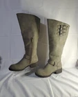 Elevate your shoe collection with these gorgeous Madden Girl Mollie Riding Tall Boots in Stone. The boots feature a stunning Almond Toe shape, Buckle Closure and low (1-1.9 in) Block Heel Style. The Stone color and Solid Pattern make them perfect for any occasion, from party to business. These beautiful boots are made with Manmade Lining Material, Suede Upper Material, and Synthetic Insole Material. Their ankle-length Shoe Shaft Style and Calf Width (Wide) make them comfortable to wear for long hours. The boots come in US Shoe Size 6.5 and have a theme of Tall boots. These boots are perfect for any woman who wants to make a statement with her shoes. Brand new w/out box - Madden Girl Mollie Riding Boot The Mollie knee-high riding boot has the perfect touch of versatile charm and street style biker-chic. These boots have a round-toe design and buckle accents, for a simple and classic look. Lug sole with block heel. Fabric Type: 100% Synthetic Sole Material: Thermoplastic Elastomers Color: Stone Approximate measurements: Shaft Height: 17.25” Heel: 1.75” Platform: 0.5” Size: 6.5 *Wide Calf Retail Price $89