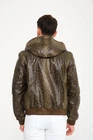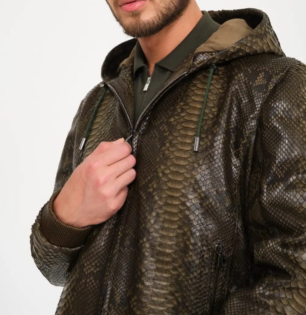 Comes as Pictured. Embrace the road with style and comfort in our dark green python embossed leather jacket, tailored to fit sizes ranging from XS to 6XL. This mid-length motorcycle jacket combines a classic biker aesthetic with a modern touch, making it a versatile addition to your wardrobe. It features a durable leather outer shell with a smooth polyester lining and insulation, ensuring warmth and ease of movement during riding, walking, or racing. Functional design meets fashion with this jacket's practical all-season wearability, complemented by a sleek hooded collar and convenient zipper accents. The jacket is equipped with pockets for your essentials and is crafted for those who appreciate the spirit of adventure, whether you're hitting the open road or heading out for a casual occasion. Keep it looking sharp with simple care through dry cleaning only.