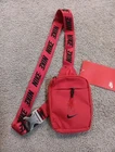 Introducing a brand new Nike crossbody shoulder chest travel mini sling bag, perfect for those who love sports and travel. Made of high-quality polyester, this bag is lightweight and durable. It features a solid bright red exterior color, with a zip closure and adjustable cross-body strap for easy access. Measuring 5 inches in width and 7 inches in height, this mini bag is perfect for carrying your essentials while on the go. It also comes with additional features such as a zip-around closure and an unisex design, making it a versatile choice for anyone who wants to keep their hands free. Get your hands on this Nike mini sling bag today!