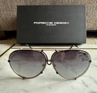 Brand new in box, never used Retail: $600 Color: Black and matte gold titanium Size: 66 Comes with original box, case, dust cloth and authentication card The iconic Porsche Design P´8478 sunglasses were the first in the world to have an interchangeable lens system. The teardrop base 6 curved lenses in the sunglasses can be easily changed with a quick-lock system that you turn to unlock and then replace with another interchangeable lens for different light conditions. Extremely lightweight titanium and highly resistant, coated lenses made from scratch-proof, almost unbreakable polycarbonate ensure that the exclusive glasses by Porsche Design are at once innovative in design and highly functional. Iconic shape and function since 1978 Includes a pair of base 6 curve interchangeable lenses made of high-quality polycarbonate with scratch-proof finish Lightweight titanium frame Tags: Porsche designer aviators sunglasses cars exotic supercars