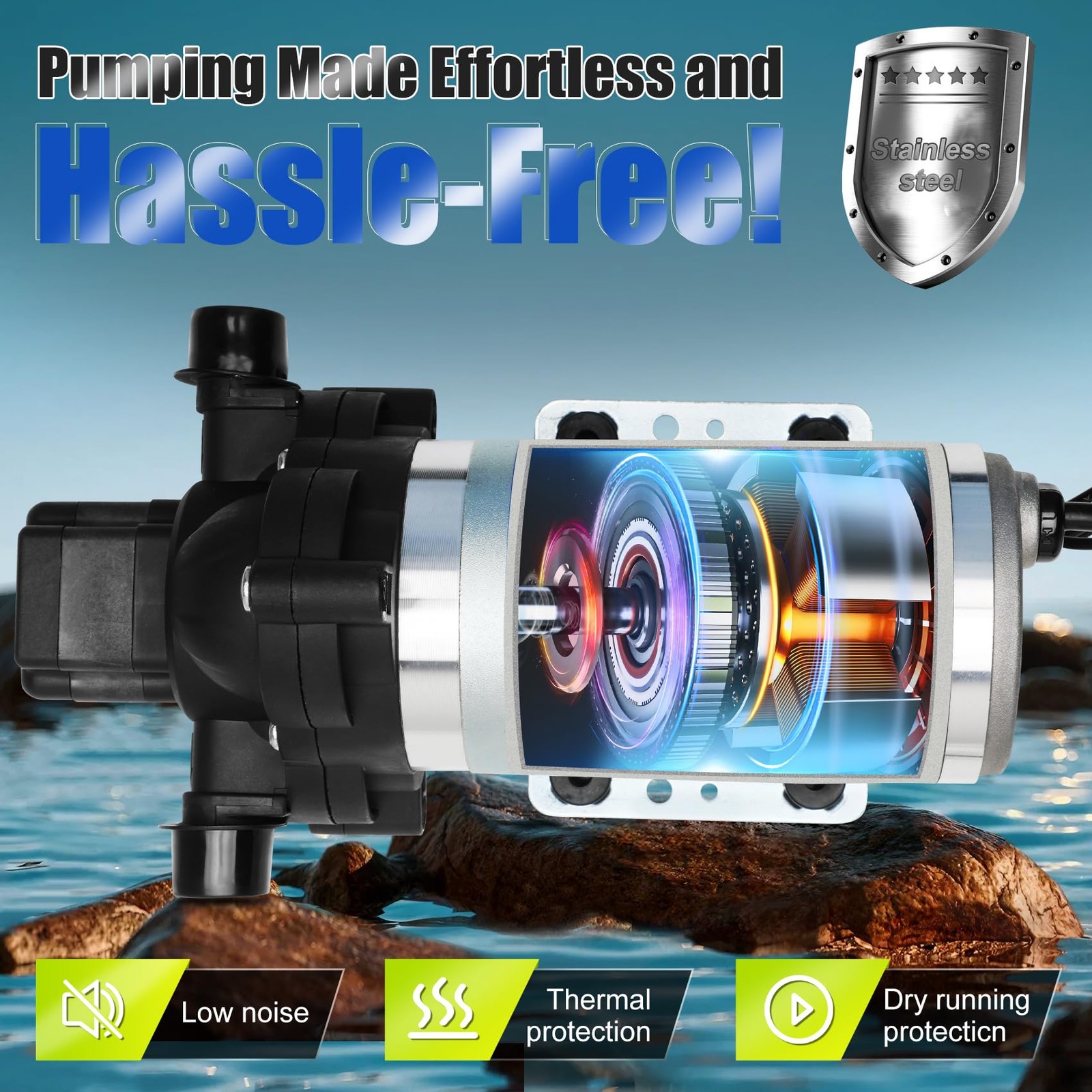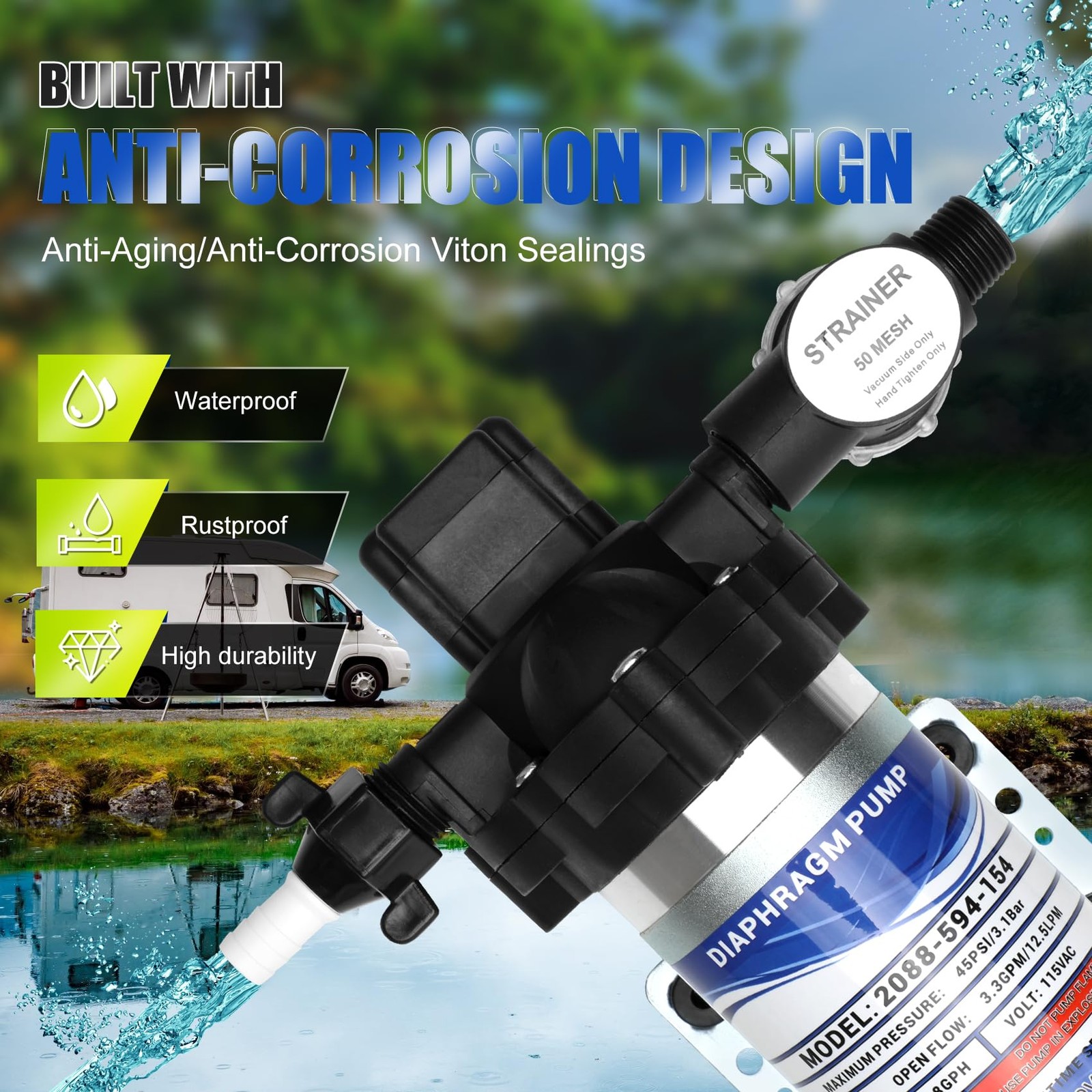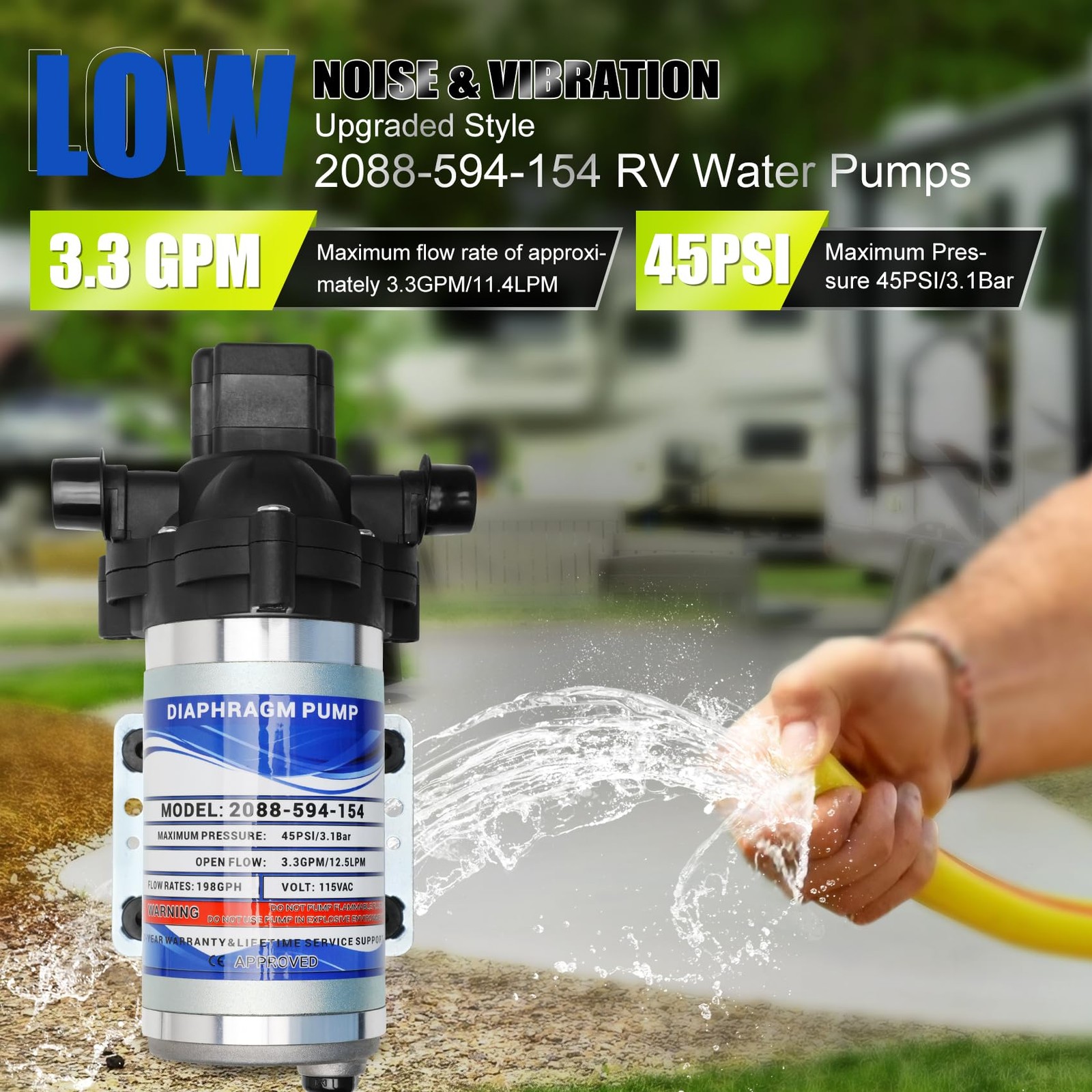NEW Power Water Pump For 115V RV 45 psi 3.3GPM Flow Rate 2088-594-154 Product Description 2088 Series Delivery Pump flows up to 3.3 gpm and self-primes. This pump is a fully automatic diaphragm pump, ideal for high-volume applications such as vending machines for both delivery and reservoir draining. The Pump activates automatically as line pressure drops and shuts off when a preset pressure is achieved. Part Type Industrial Pump - 198 GPH, 115 Volt, 1/2in Part Number 2088-594-154 Fitment For RVs, Motorhome, & Caravan's Features Self Priming up to 12 vertical lift feet (3.7m) Used in delivery and transfer applications up to 3.3 gpm NSF Listed Prevents back flow of fluid through the pumps Automatic shut-off Can run dry without damage Package Includes 1x Power Water Pump Accessories as shown Professional installation is recommended. Please check the part number and illustrations carefully to ensure that it fits your model. If you are not sure, please contact us and we will respond as soon as possible. Payment💵 Shipping🚚 Returns🚛 Contact us📞 Feedback✨ Payment💵 We accept Paypal only for the payment, and all orders should be paid through Ebay auction, please do not pay directly to our Paypal account. Paypal allows to pay by Credit Card, Direct Debit, VISA, eCheck, or other methods, please kindly check Paypal for more information. Please use the eBay checkout system when paying for your order. Immediate payment is required for all orders. Shipping🚚 All of our products ship from the United States Please leave us your full name, your telephone number and detailed address when ordering. We ship to your eBay or Paypal address. Please make sure your eBay and Paypal address is correct before you pay the order. We try our best to pack the item as good and safe as possible ,so they always arrive in a good condition.If the item arrives damaged, please contact us before returning it, and we will send you a replacement or provide you with a satisfactory solution. Important notice: * Please update your phone number for delivery contact when checking out. * Changing shipping address is not available after the shipment. Returns🚛 If you are not satisfied with the product, we support returns and refunds You can return the products in 30 days aftre receiving the products. Please contact us for the authoried free return label before sending back. To speed up the process, please let us know the reason why you want to return. If the reason is our side, please take some picture or video for evidence. Contact us📞 We are here to help with any questions or problems you may have. Please feel free to contact us by eBay message. We will reply all your messages promptly .Some message sent after business hours will be replied within 12 hours. We strive for 100% c ustomer satisfaction! FEEDBACK IS VERY IMPORTANT TO US. We request that you contact us immediately BEFORE you give us neutral or negative feedback, so that we can satisfactorily address your concerns. Feedback✨ Your feedback is very important to us. If you can't leave us a " 5-Star " rating and a positive feedback, please contact us without hesitation before leaving feedback. We are eager to work with our customers. We believe in communication. Give us a call or send us an email, we will make things right for our buyers. Positive feedback for our buyers will be left automatically by eBay Seller Manager Pro.