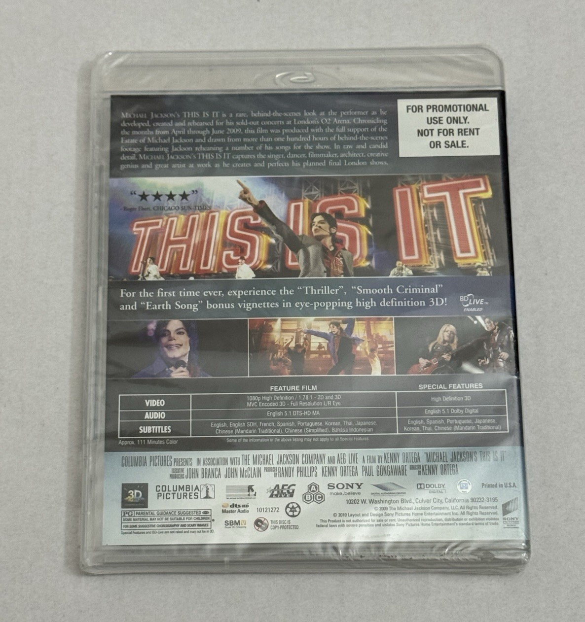 The product is a new, sealed promo Blu-ray of the 3D enhanced edition of Michael Jackson's "This Is It" documentary. This edition offers viewers an immersive experience with enhanced visuals and likely additional content related to the iconic performer and his famous touring show. Fans of Michael Jackson will appreciate the opportunity to own this special version of the film, which promises to bring a unique and captivating viewing experience. ___________________________________________________________________________________________________________ SHIPPING: FAST AND FREE SAME BUSINESS DAY SHIPPING ALL ORDERS SHIPPED WITHIN 24 HOURS OF PAYMENT (FOR HOLIDAYS AND WEEKENDS, ITEMS SHIP NEXT AVAILABLE BUSINESS DAY). GUARANTEE: ALL MEDIA ARE GUARANTEED TO PLAY AS INTENDED I WORK HARD TO ASSURE CUSTOMER SATISFACTION; SO, IF YOU EVER RECEIVE A CD THAT DOES NOT MEET THIS GUARANTEE, SIMPLY CONTACT ME AND I WILL RESOLVE ANY ISSUES AMICABLY.. YOU MAY RETURN IT FOR A FULL REFUND OR EXCHANGE; INCLUDING SHIPPING BOTH WAYS . CASES MAY HAVE STICKERS, STICKER RES, OR OTHER MINIMAL SIGNS OF WEAR. Please note: Any mention of a digital copy or code may be expired and/or unavailable. However, this does not affect the quality or functionality of the DVD. THANK YOU!