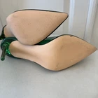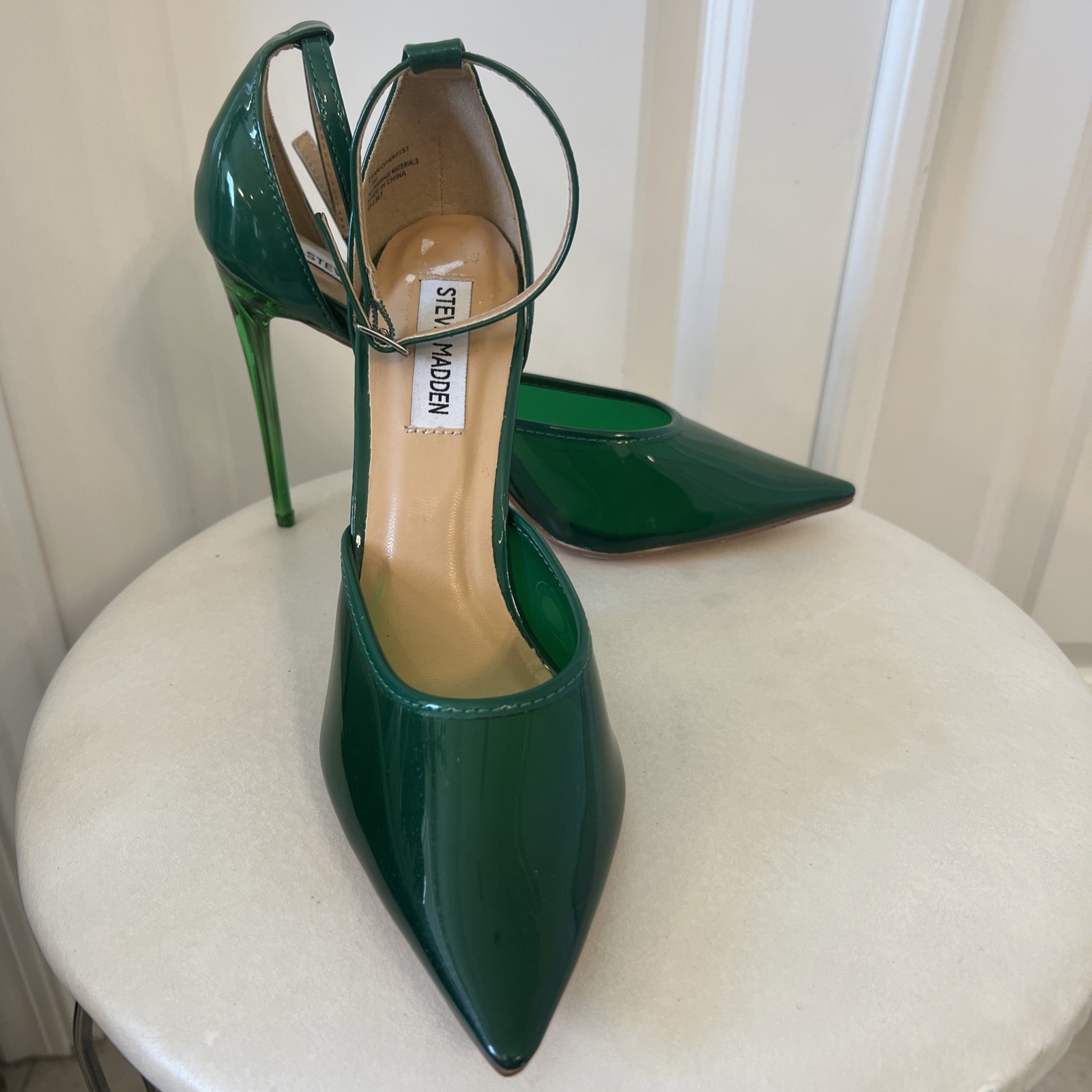 These Steve Madden Opar Emerald Green Pointed Stilettos in size 7.5M are a stunning choice for various occasions such as weddings, parties, and formal events. With an ultra-high stiletto heel and a standard shoe width, these pumps are designed for both style and comfort. The ankle strap with an adjustable buckle closure adds a touch of elegance to the solid green color and synthetic outsole material. Perfect for the fashion-forward woman looking to make a statement with her footwear.