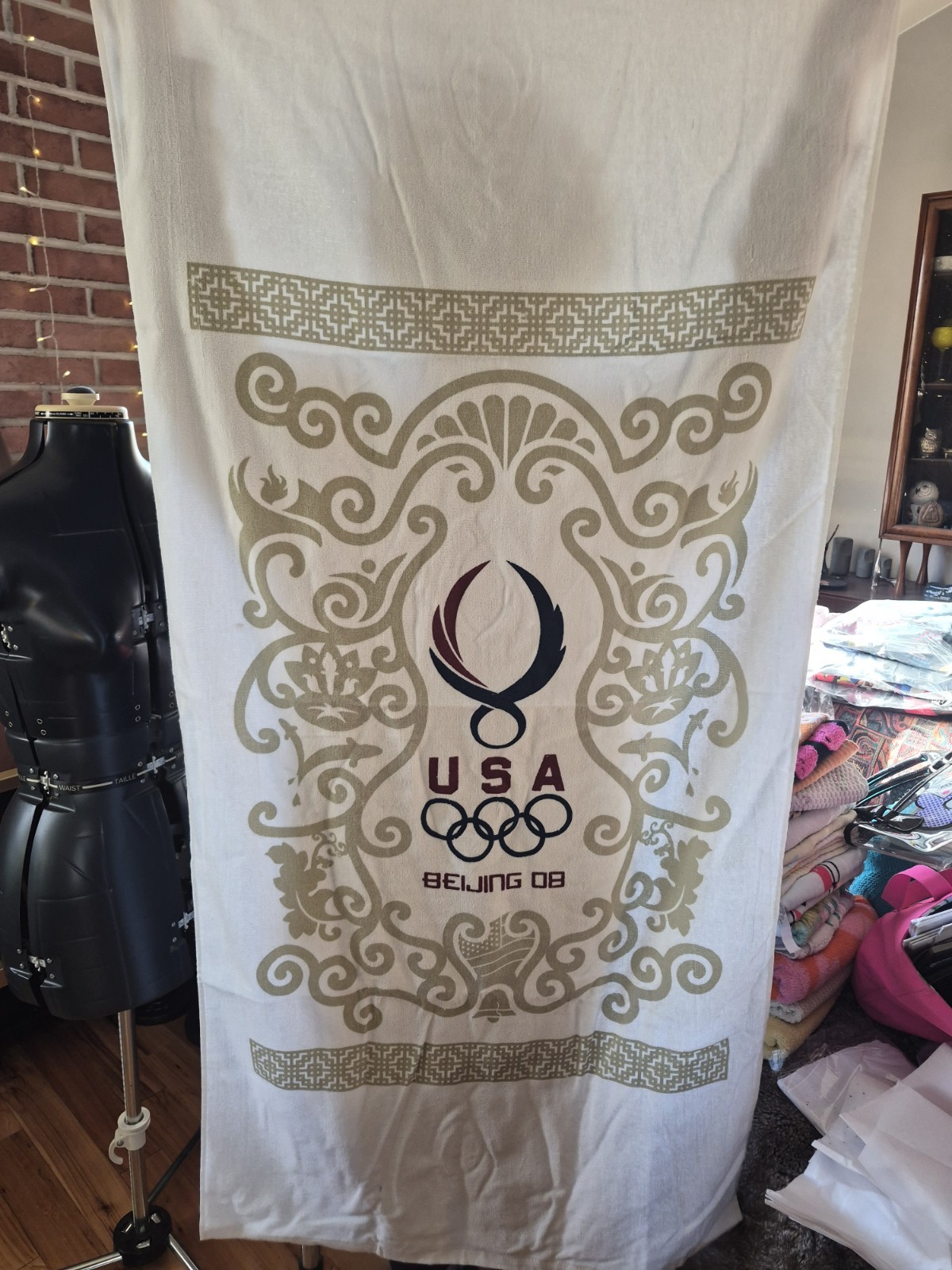 This product is a 60" long and 30" wide white towel featuring the USA Olympic team logo, would make a great addition to any Olympic memorabilia collection. Smoke free home. No tags.