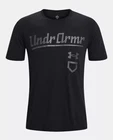 This is a men's Under Armour T-shirt in size XL, featuring a graphic print of the brand's baseball script logo in black and grey colors. The shirt has short sleeves, a crew neck, and is made of a cotton blend jersey fabric, making it lightweight and breathable for all seasons. The fit is regular, suitable for everyday wear, and the design theme is a classic sports style, perfect for sports enthusiasts or casual wear.