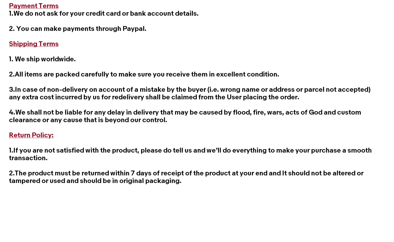 About Us We are a renowned export house which deals in all type of spare parts for Royal Enfield, Vespa, Lambretta, Bajaj and LML Scooters, Tools, Car Parts, etc We sell only high quality spare parts which goes through stringent quality checks before reaching the end user. Please feel free to contact us at any time of the day and we will surely get back to you within 12 hours from the time of your query. Payment Terms 1. We accept payments through Ebay payments only and you can use your credit card, debit card, net banking, etc to make the payment. Shipping Terms 1. We ship worldwide. 2. We do give shipping discounts on combined purchases. 3. All goods are shipped within 24 hrs after the payment. 4. All the goods are delivered via Fedex, DHL, UPS and Aramex and we only use Express Shipping for delivery of the products. 5. All items are packed carefully to make sure you receive them in excellent condition. 6. Please provide your telephone no, as the shipping company might need it at the time of delivery. 7. In case of non-delivery on account of a mistake by the buyer (i.e. wrong name or address or parcel not accepted) any extra cost incurred by us for re-delivery shall be claimed from the buyer placing the order. 8. We shall not be liable for any delay in delivery that may be caused by flood, fire, wars, acts of God and custom clearance or any cause that is beyond our control. Return Policy If you are not satisfied with the product, please do tell us and we’ll do everything to make your purchase a smooth transaction. 1. The product must be returned within 30 days of receipt of the product at your end and It should not be altered or tampered or used and should be in original packaging. 2. Buyer has to bear all expenses for returning. Please ensure that you send the product back though a reliable insured courier/shipping mode. 3. The Refund would be issued within 7 Business days after receipt of the product. 4. Any dispute regarding the product is subject to New Delhi (INDIA) Jurisdiction. Important Notice to Foreign Buyers located outside of the INDIA On Import Duty 1) Ebay charge VAT @ 19% on transaction upto GBP 150 for UK, Euro 150 For EU and AUD 150 for Australia. The goods on which VAT is charged by Ebay customer’s are not liable to pay any import duty. If there are any charges claimed by the courier company please do inform us about the same and we will help you resolve this. 2) To avoid any subsequent misunderstandings, please note that importing goods from another country can mean that your national Customs authorities may charge you Customs Duty and/or other additional related taxes (for example a Value Added Tax or a Purchase Tax). YOU, as the importer, are responsible for paying any such taxes. We have no control over what taxes you may be charged by your own national tax authorities. We are not responsible for compensating you for payment of any such taxes. If you do not know how much (if any) import tax you might have to pay, please check with your local tax authorities BEFORE entering into a contract to purchase. 1. If your goods are retained or confiscated by your own national Customs authorities for any reason, it is your responsibility alone to negotiate with them the terms on which such goods might be released to you. 2. If your goods are undeliverable for any reason and are returned to us, we reserve the right to reclaim from you any associated costs which may be charged back to us. 3. On any Customs forms, we declare the full purchase price as the value of the goods. Disclaimer By purchasing any item sold here, the buyer accepts that he/she is in compliance with Local laws and regulations regarding the purchase, ownership, and use of the item. The buyer agrees to indemnify and hold harmless our eBay store, company or its licensors for all claims resulting directly or indirectly from the purchase, ownership, use or misuse of the item in violation of applicable Federal, State, and Local laws or regulations. You must be 18 or older to purchase. We are not authorized agents for any two wheeler manufacturers in India. Any/all trademarks mentioned on your eBay store and eBay listings are for descriptive purposes only and are the property of their respective owners.
