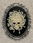 Up for sale is a scary new Victorian-style Halloween cameo brooch that features a scary medusa with a skull for a face. This brushed silver tone metal & resin brooch measures approximately 2 inches by 1 1/2 inches. It has a safety pin type clasp to hold it firmly in place. This scary brooch is perfect for all of your Halloween (or other spooky holiday) activities! FREE SHIPPING & TRACKING TO US DESTINATIONS! This item is from a non-smoking home. NOTE: Please read and fully understand the item description and the following paragraphs prior to bidding on this item. If you have any questions, please contact us via Ebay message before you place a bid. PAYMENT POLICY: Payment of the final auction price, listed shipping charges, and shipping insurance (if purchased) must be received within 7 days of the end of the auction. We prefer PayPal. SHIPPING CHARGES: Below is a list of our shipping charges, we automatically combine shipping costs on multiple purchases of jewelry or similar size items, we also combine shipping on different size items, please ask for a quote or wait for an invoice before paying for your multiple item order: US DESTINATIONS INTERNATIONAL DESTINATIONS . FREE GLOBAL SHIPPING PROGRAM . REMINDER: When purchasing more than one item, please wait for us to send you an invoice with the total price before paying for your items, this will ensure you receive the full benefit of our combined shipping. NOTE: These shipping charges are for US Postal Service First Class Mail to US destinations only; other shipping methods are available at an additional cost to the buyer (see the paragraph that outlines our shipping methods below). SHIPPING METHODS: We ship all items via US Postal Service First Class Mail to US destinations unless otherwise noted in the item description. US Postal Service Priority Mail or Express Mail may be requested and will be an additional cost to the buyer. Please contact us via Ebay message if you have any questions on shipping charges. SHIPPING PROMISE: We promise to ship your item within 24 hours of receipt of a cleared payment for items in which payment is received on Sunday through Thursday. For items in which payment is received on a Friday or Saturday, shipment will be on Monday, if Monday is a holiday these items will be shipped on Tuesday. (Due to the ever-increasing price of fuel, we can no longer ship items on weekends or holidays, the Post Office is too far away to make this feasible). Please remember that there may be times when it is not possible to ship an item with 24 hours, for these rare situations, we will notify you via Ebay message. SHIPPING INSURANCE: Not offered. RETURN POLICY: In the unlikely event that your item arrives damaged or is not as described or pictured in the auction listing, please contact us via Ebay message immediately upon item arrival and return the item to us within 30 days. Return shipping charges are the buyers responsibility and will not be refunded. We reserve the right to inspect the item prior to shipping a replacement item or issuing a refund. If the results of our inspection of the item are favorable we will send you a replacement item identical to the auction listing for the item you purchased. If no replacement item is available and the results of our inspection of the item are favorable, we will issue a refund for the initial cost of the item and initial shipping charges. In the event our inspection of the item reveals damage or other misuse not normally caused by routine handling during shipping, we reserve the right to refuse to replace the item or grant a refund. GUARANTEE: We strive to provide the best possible service and merchandise at low starting bids, we also strive to ensure our buyers are satisfied with their purchase; finally we value our outstanding Ebay Feedback rating. If you are not satisfied with your item when it arrives or if there was a problem with the transaction, PLEASE contact us via Ebay message before you resort to leaving NEUTRAL or NEGATIVE feedback. We will do our best to resolve the situation to the satisfaction of both parties. As a reminder, not every situation can be resolved to the mutual satisfaction of both parties and we reserve the right to make the final determination in all such cases.