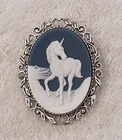 Up for sale is a beautiful new Victorian-style cameo brooch that features a white unicorn set against a blue background. The brushed silver tone metal frame & resin brooch measures approximately 2 inches by 1 1/2 inches. The frame has a safety pin type clasp on the back to hold it firmly in place. This beautiful brooch is perfect for any occasion! SHIPMENT TRACKING INCLUDED FOR ALL US DESTINATIONS This item is from a non-smoking home. NOTE: Please read and fully understand the item description and the following paragraphs prior to bidding on this item. If you have any questions, please contact us via E-bay message before you place a bid. PAYMENT POLICY: Payment of the final auction price, listed shipping charges, and shipping insurance (if purchased) must be received within 7 days of the end of the auction. We prefer PayPal. SHIPPING CHARGES: Below is a list of our shipping charges, we automatically combine shipping costs on multiple purchases of jewelry or similar size items, we also combine shipping on different size items, please ask for a quote or wait for an invoice before paying for your multiple item order: US DESTINATIONS INTERNATIONAL DESTINATIONS . FREE GLOBAL SHIPPING PROGRAM REMINDER: When purchasing more than one item, please wait for us to send you an invoice with the total price before paying for your items, this will ensure you receive the full benefit of our combined shipping. NOTE: These shipping charges are for US Postal Service First Class Mail to US destinations only; other shipping methods are available at an additional cost to the buyer (see the paragraph that outlines our shipping methods below). SHIPPING METHODS: We ship all items via US Postal Service First Class Mail to US destinations unless otherwise noted in the item description. US Postal Service Priority Mail or Express Mail may be requested and will be an additional cost to the buyer. Please contact us via E-bay message if you have any questions on shipping charges. SHIPPING PROMISE: We promise to ship your item within 24 hours of receipt of a cleared payment for items in which payment is received on Sunday through Thursday. For items in which payment is received on a Friday or Saturday, shipment will be on Monday, if Monday is a holiday these items will be shipped on Tuesday. (Due to the ever-increasing price of fuel, we can no longer ship items on weekends or holidays, the Post Office is too far away to make this feasible). Please remember that there may be times when it is not possible to ship an item with 24 hours, for these rare situations, we will notify you via E-bay message. SHIPPING INSURANCE: Not offered. RETURN POLICY: In the unlikely event that your item arrives damaged or is not as described or pictured in the auction listing, please contact us via E-bay message immediately upon item arrival and return the item to us within 30 days. Return shipping charges are the buyers responsibility and will not be refunded. We reserve the right to inspect the item prior to shipping a replacement item or issuing a refund. If the results of our inspection of the item are favorable we will send you a replacement item identical to the auction listing for the item you purchased. If no replacement item is available and the results of our inspection of the item are favorable, we will issue a refund for the initial cost of the item and initial shipping charges. In the event our inspection of the item reveals damage or other misuse not normally caused by routine handling during shipping, we reserve the right to refuse to replace the item or grant a refund. GUARANTEE: We strive to provide the best possible service and merchandise at low starting bids, we also strive to ensure our buyers are satisfied with their purchase; finally we value our outstanding E-bay Feedback rating. If you are not satisfied with your item when it arrives or if there was a problem with the transaction, PLEASE contact us via E-bay message before you resort to leaving NEUTRAL or NEGATIVE feedback. We will do our best to resolve the situation to the satisfaction of both parties. As a reminder, not every situation can be resolved to the mutual satisfaction of both parties and we reserve the right to make the final determination in all such cases.