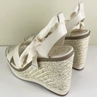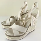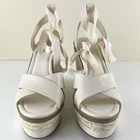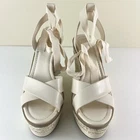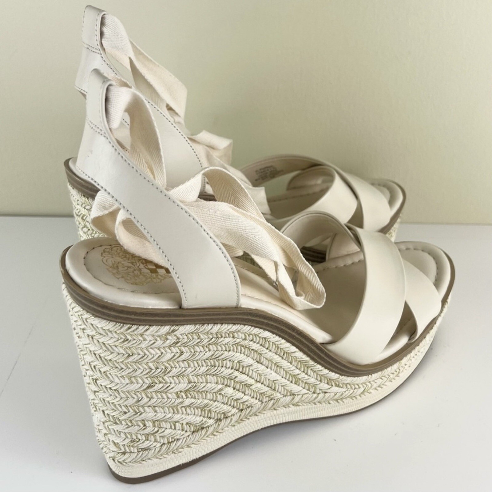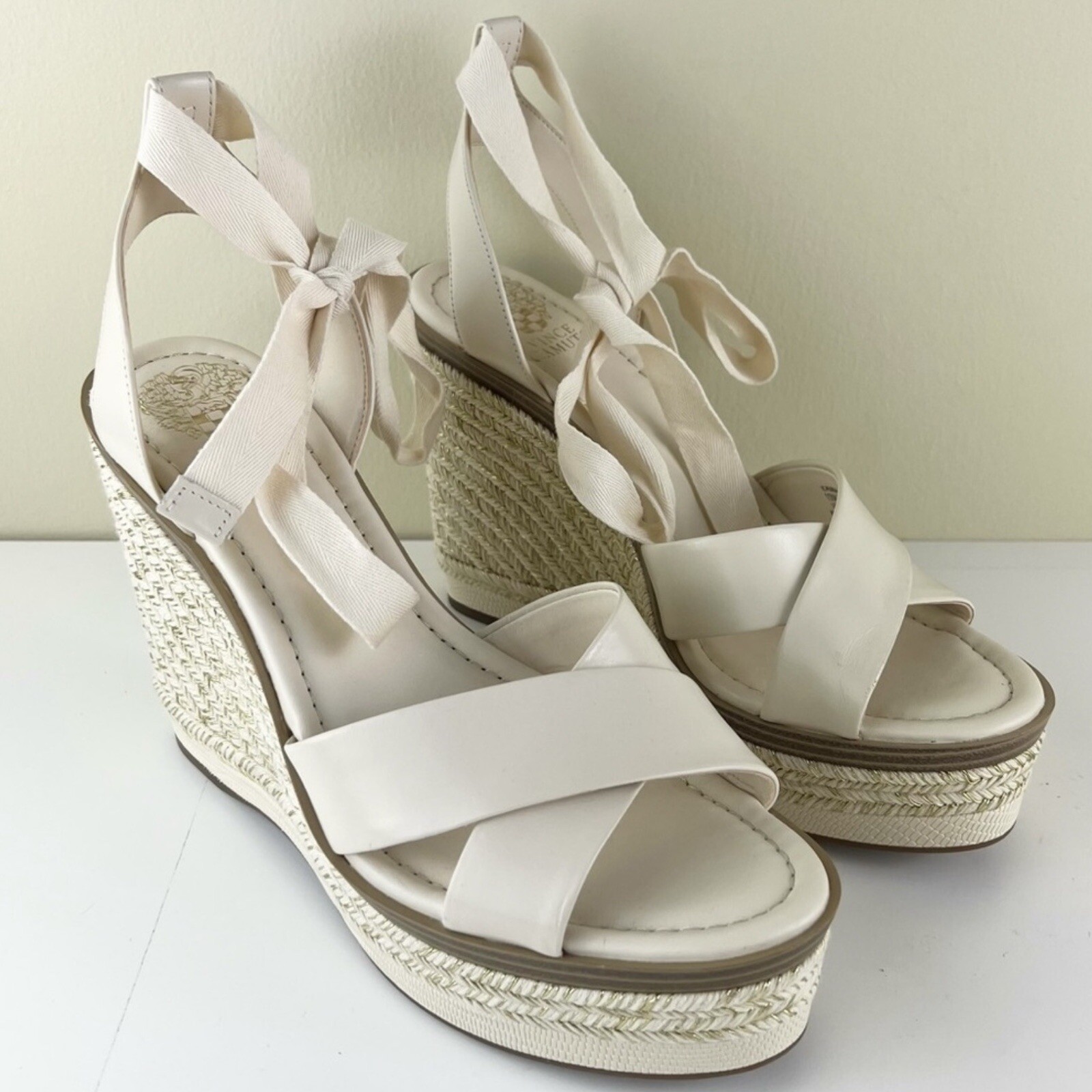 NEW VINCE CAMUTO BEIGE PLATFORM WEDGE SANDALS 10 NEW WITHOUT BOX *few scuffs/scratches/marks on ties from handling* SIZE- 10 M DETAIL: - Open round toe - Crisscross strap vamp - Adjustable ankle tie close - Jute-wrapped platform wedge heel COLOR- warm vanilla MATERIAL- leather upper, manmade lining and sole