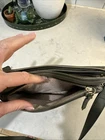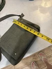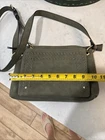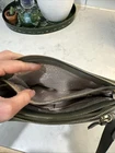 The Never Used Violet Ray NYC Olive Green with Gold Accents Suade Crossbody Purse is a stylish and trendy accessory for women. With a solid olive green exterior and gold accents, this small-sized purse features a zip closure and a suede handle/strap in the same olive green color. The interior is lined with beige, adding a touch of elegance to the design. The crossbody style makes it easy to carry on-the-go, perfect for everyday use or special occasions. Made by Violet Ray, this purse combines fashion and functionality seamlessly. NEVER USED