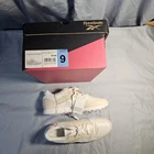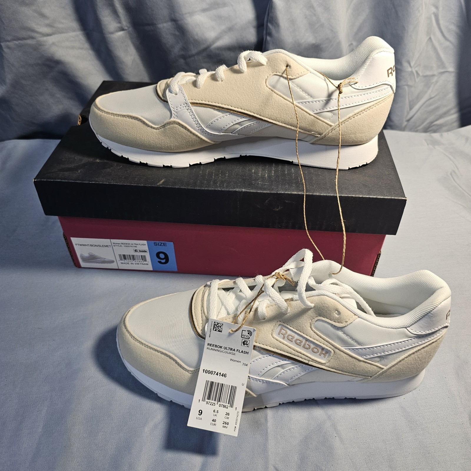 The Reebok Women's Ultra Flash Lightweight Lace Up Running Shoe in size 9 (UK 6.5, EU 40) is a stylish and modern sneaker designed for activewear occasions. Featuring a low top shaft style and lace-up closure, this shoe is made with a durable synthetic upper and soft EVA compound outsole for cushioning and breathability. The white/tan color combo adds a trendy touch, while the easy-care, flexible, and lightweight design makes it suitable for all seasons. With its Reebok branding and innovative features, this shoe is a must-have for women looking for a versatile and comfortable athletic option.
