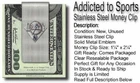 * ADDICTED TO SPORTS STAINLESS STEEL MONEY CLIP * PERFECT GIFT FOR CHRISTMAS, BIRTHDAYS, FATHER'S DAY OR ANY OCCASION IN STOCK AND READY TO SHIP - SUPPLY IS LIMITED This durable corrosion-resistant stainless steel money clip comes to you in new, unused condition. It is gift ready and sealed in a clear resealable package. The solid metal emblem is skillfully hand painted with lasting enamel colors and protected with a tough epoxy/resin finish. The recommended capacity is for 10 to 15 bills which are folded in half or 3 to 5 cards. Stainless Steel is an exceptionally durable metal. It is a product of industrial ingenuity, specifically crafted to be durable and retain its shine while allowing it to withstand the wear and tear of everyday activities as well as resisting scratches and corrosion. The hard metal thanks to an invisible layer of chromium that prevents oxidation makes it a wonder metal of choice. Maintaining stainless steel is also much easier as you will not need to use special cleaning solutions to care for your stainless-steel. Just use warm water along with a small amount of liquid soap and your stainless-steel accessory will last and stay as good as new. This item is the perfect gift for any day you want to make a special day, for Christmas, birthdays or any occasion. Please check our store for related items. We offer many unique items that cannot be found anywhere else on the Internet. Thank you for looking. Click Here to see MORE of our Unique Jewelry Visit our eBay Store: Fast and Trackable Shipping: We process most orders within 24-48 hours Monday-Friday. You will receive tracking information the day your package ships. Most packages arrive within 3-7 Business Days. An automatic email is sent to you when payment is received. An automatic email is sent to you when your order has been processed and shipped. ORDERS ARE NORMALLY PROCESSED AND SHIPPED WITHIN 1-2 BUSINESS DAYS (more frequent near the Christmas holiday season). 100% Satisfaction Guarantee: We work hard to ensure that your shopping experience is completely satisfying and enjoyable. Along with great selection and prices, our number one concern is offering superior customer service, and we are here to serve you. If you are not 100% happy with your purchase, you may return the product to us for a refund. Only unused items, in original packaging & paperwork can be returned for refund. Contact Us: If you have any questions and would like to contact us, please send us an email anytime. We will do our best to reply to your emails as soon as possible. INTERNATIONAL CUSTOMERS: BUYER PAYS SPECIFIED SHIPPING & HANDLING AMOUNT (SEE ITEM DESCRIPTION). INTERNATIONAL PURCHASES ARE LIMITED TO ONE ITEM PER SHIPMENT. Please allow 15-18 BUSINESS DAYS for delivery. Visit our eBay Store: