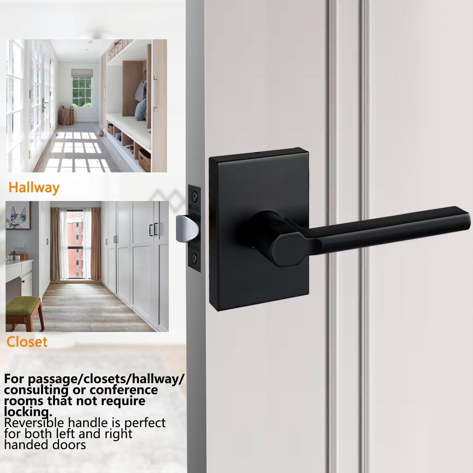 Solid Door Lever Handle with Key-less for Hall & Closet Door Passage Square Non-Locking Lever Set - Matte Black Passage Door Lever: It is keyless door lever,it has no key and no way to lock it,It is suitable for interior or store doors that do not need to be closed. Reversible Door Lever Handle Fit left hand door and right hand door. Square corner, non-removable plate Adjustable Latch : 60mm(2-3/8") or 70mm (2-3/4") latch; Fit all doors of 35 to 45 mm(1-3/8" to 1-3/4")thickness. Fit all U.S.Standard Size Door Easy Installation: All you need a screwdriver! No need for professional door fitters,it is perfect for DIY. Fit all U.S.Standard Size Door Material : Zinc Alloy Finish : Matte Black Part List: 1 Installation template and Instruction 1 Door Lever Set 1 Strike Plate 1 Adjustable Latch 1 Strike Box 7 Screws Package 【Key-less】It is a decorative handle, it has no key and no way to lock it. It is suitable for interior or store doors that do not need to be closed. 【Universal】This lever is reversible. Fits left and right hand doors. 【Adjustable Backset】2-3/8 inch or 2-3/4 inch (60mm or 70mm); Fits doors thickness:1-3/8 inch to 1-3/4 inch (35mm to 45mm). 【Material】Zinc Alloy,Brushed Nickel Finish. 【Easy Installation】Contains all accessories and installation instructions,Only need a screwdriver to install.