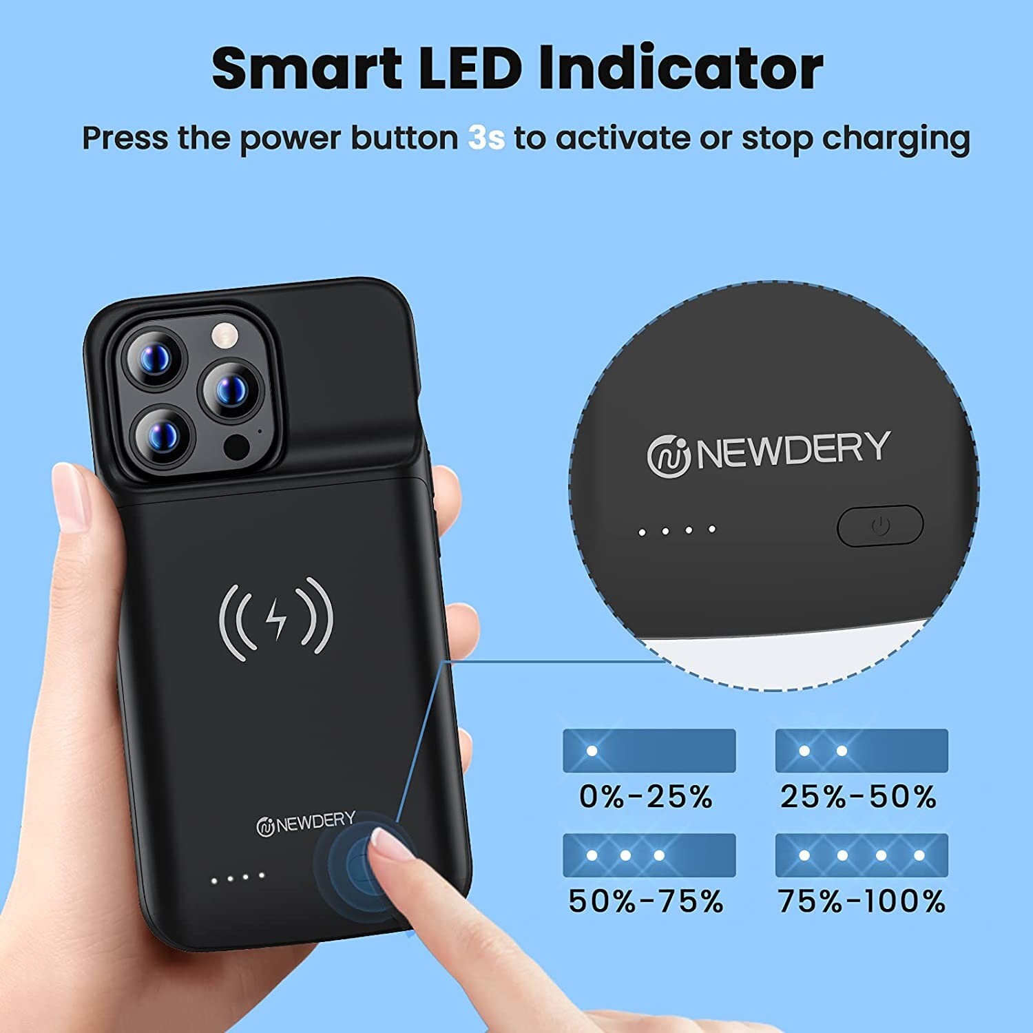 [Extended 110% Battery Life] ONLY for iPhone 13 Pro/iPhone 13! The battery case built-in 5000mAh capacity, it can full charge your phone 1.1 times. Slim and portable design allows you put it in your pocket or handbag. Power your phone anytime anywhere. [Qi Wireless Charging & Sync-data Supported] You can charge your iPhone 13 pro and the battery case simultaneously via Qi wireless charging pad. And the charger case support the sync-data function, you don't need to remove the battery case any more. *NOTE*: There is no wireless charging logo on case. If you have any problem about the wireless charging, please feel free to contact us via your order. [Compatiable with Wired Headphone & Apple Pay] You can use the enjoy the music with original wired headphone or Bluetooth headphone while charging your iPhone 13 via the case. And you can enjoy the convenience of the Apple pay without removing battery case. Make your life more funny and convenience. [ Full Protection & Safe Charging] Soft rubber and hard shell plate protect your phone from scratches and collisions. Raised bezels help you to protect the screen to some extent. Built-in smart chip protect your iPhone from overheating, short-circuit and overcharging. Provides a safe charging environment for your iPhone 13 Pro & iPhone 13. [What you get] Package including: 1*Battery Case for iPhone 13 Pro/iPhone 13, 1*User Manual Product Specifications: 1. Input: 5V/1.5A 2. Output: 5V/1.0A 3. Dimensions: 5.97*3.05*0.74 inch; Weight: 140g 4. Compatibility: Only fit for iPhone 13 Pro & iPhone 13 & iPhone 14 Pro & iPhone 14-6.1inch! 5. Powerful 5000mAh Li-polymer rechargeable extended battery effectively adds 110% battery life to your iPhone 13 Pro or iPhone 13. 6. Compatiable with Qi Wireless Charging, Wired Headphone, Apple Pay and Sync data function. *NOTE*: Doesn't support magnetic charging. 7.Time of iPhone 13 Pro/13 Battery Case charge phone: 3.2h 8.Time of simultaneously charging the case and phone by original cable: 7.6h 9.Time of simultaneously charging the case and the phone by Wireless Charge Pad: 9.3h