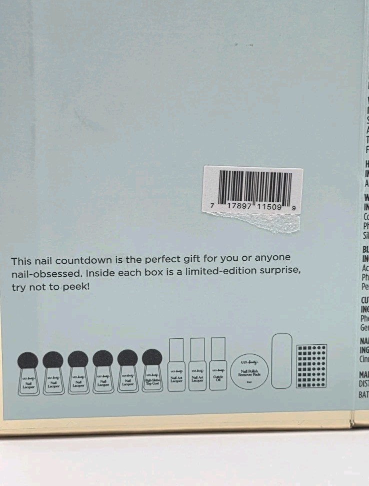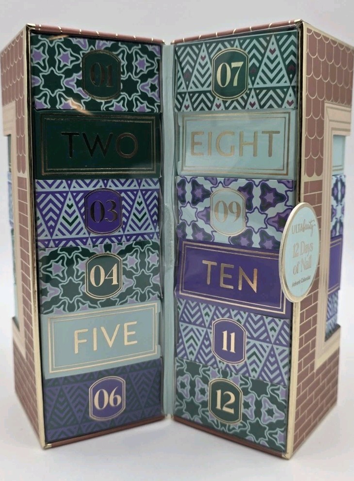 Ulta Beauty12 Days of Nail Advent This nail countdown is the perfect gift for you, or anyone nail obsessed. Inside each box is a limited-edition mini surprise, try not to peak! 4 Mini Nail Lacquers High-Shine Topcoat 2 Mini Nail Art Lacquers Nail Gems Nail Polish Remover Pads Cuticle Oil Nail File