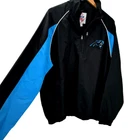 NFL Carolina Panthers Jacket Mens Large 1/4 Zip Pullover Black Blue Windbreaker Very good condition, see all pictures for views. WRITING IN MARKER ON INSIDE TAG. •Pit to pit: 24" •Shoulder to hem: 29" Ships out same day or next open postal day. Thank you for your purchase, we appreciate you!