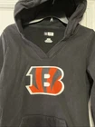 The product is a black NFL Cincinnati Bengals sweatshirt designed for women in size small. It features the official logo of the Cincinnati Bengals, a team in the National Football League (NFL). This sweatshirt is perfect for female fans of the Cincinnati Bengals who want to show their team spirit while staying comfortable and stylish.