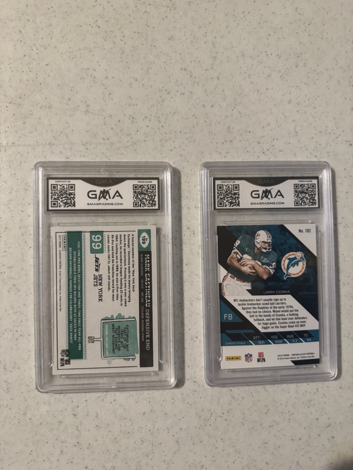 The NFL GMA Graded Card Lot consists of standard size football trading cards from the National Football League (NFL). Manufactured by Panini, these original cards feature rookie players and come with a label or sticker autograph. The cards are made of card stock and are in English language, perfect for sports card collectors looking to add to their collection of NFL memorabilia. NFL GMA 2 Card Lot