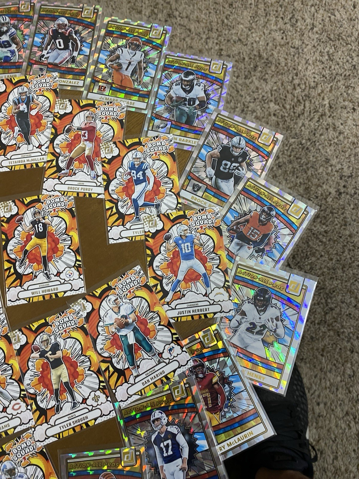 The NFL Trading Card Lot includes 70 cards featuring players from the National Football League (NFL). The lot includes cards from various sets such as Gridiron Kings, Bomb Squad, AAPros, and Hog Heaven. Each card showcases a different player or moment from the world of football, making it a valuable addition to any sports trading card collection. Perfect for fans and collectors looking to add some NFL flair to their collection.