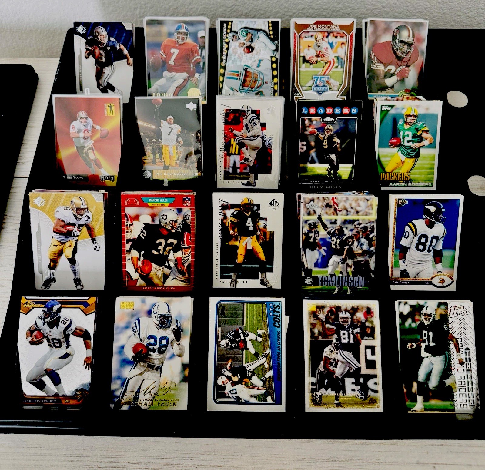 This NFL football card lot features over 175 cards of Hall of Fame stars and legends, including iconic players such as Jerry Rice, Joe Montana, John Elway, Steve Young, and Peyton Manning. The standard-sized cards are made of high-quality card stock and are original prints, not reprints. The lot does not include an autograph but showcases players from the Dallas Cowboys and other NFL teams, making it a must-have for football card collectors and fans of the sport. Tony Romo dan Marino, Joe Montana, Jerry Rice Ben Roethlisberger, Peyton Manning, Drew Brees, Aaron Rodgers, Marcus Allen Reggie bush , Brett Favre, Chris Carter, Adrian Peterson Marshall Faulk Eric Dickerson, Terrell Owens Tim Brown. All cards are ex +. Note. Tray not included