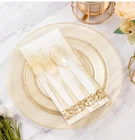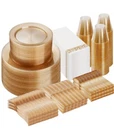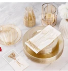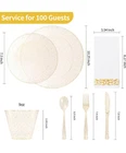 NIB IDEAL FOR PARTIES - With these disposable dinnerware, you can easily host a party without worrying about the cleanup at the end. You can throw them in the trash after use. These gold glitter plastic party plates are great for weddings, holidays, baby showers, business parties, Thanksgiving, Halloween, and Christmas dinners. 100% BPA Free - These disposable party plates are made of food-grade, reusable plastic that is non-toxic and BPA-free. If you need to reuse the dishes, simply wash them with water. NOTE: These disposable dishes are not recommended for use in the microwave or dishwasher. STURDY & DURABLE - These heavy-duty disposable plastic plates are made of hard plastic and are thick enough to avoid deformation or breaking from plates, knives, and forks. They can handle hot, cold, and wet food without leaks or spills. ELEGANT DESIGN - These party plates with gold powder look premium and similar to porcelain. Their elegant appearance can meet the aesthetic requirements of all people, and they can be used for any occasion without a sense of incongruity. WHAT YOU GET - 50 big plates 50 small plates 100 cups 50 forks 50 spoons 100 knives 100 napkins