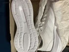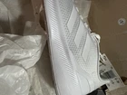 The NIB Adidas Runfalcon 3.0 W White On White sneakers for women in size 8.5 feature a stylish design with a lace-up closure and breathable mesh upper material. These athletic shoes are lightweight, cushioned, and suitable for various activities such as gym training, walking, and running. The solid white color with gold accents and logo detailing adds a trendy touch to the sneakers, which are perfect for both casual wear and activewear occasions. Made with a rubber outsole, these sneakers are durable and comfortable for all-day wear, making them a great addition to any sports-themed wardrobe. Small cleanable scuff in picture 5. Box is damaged.