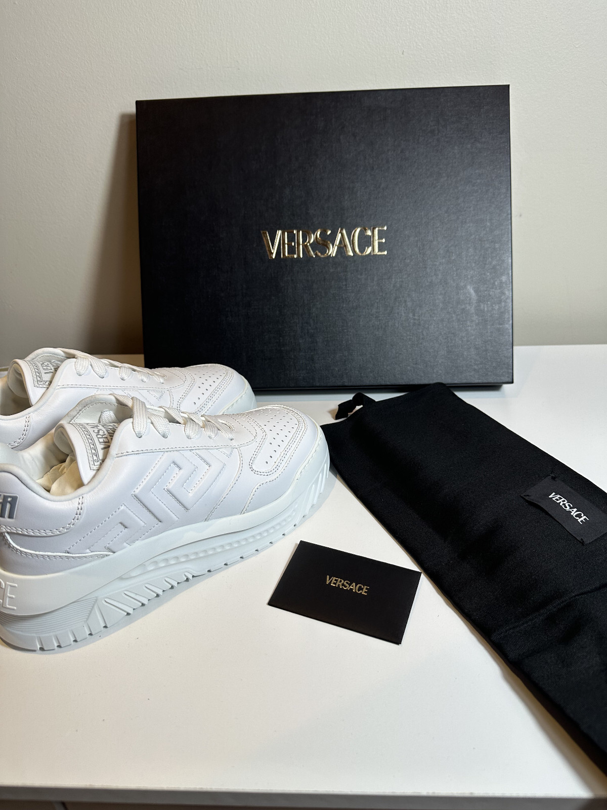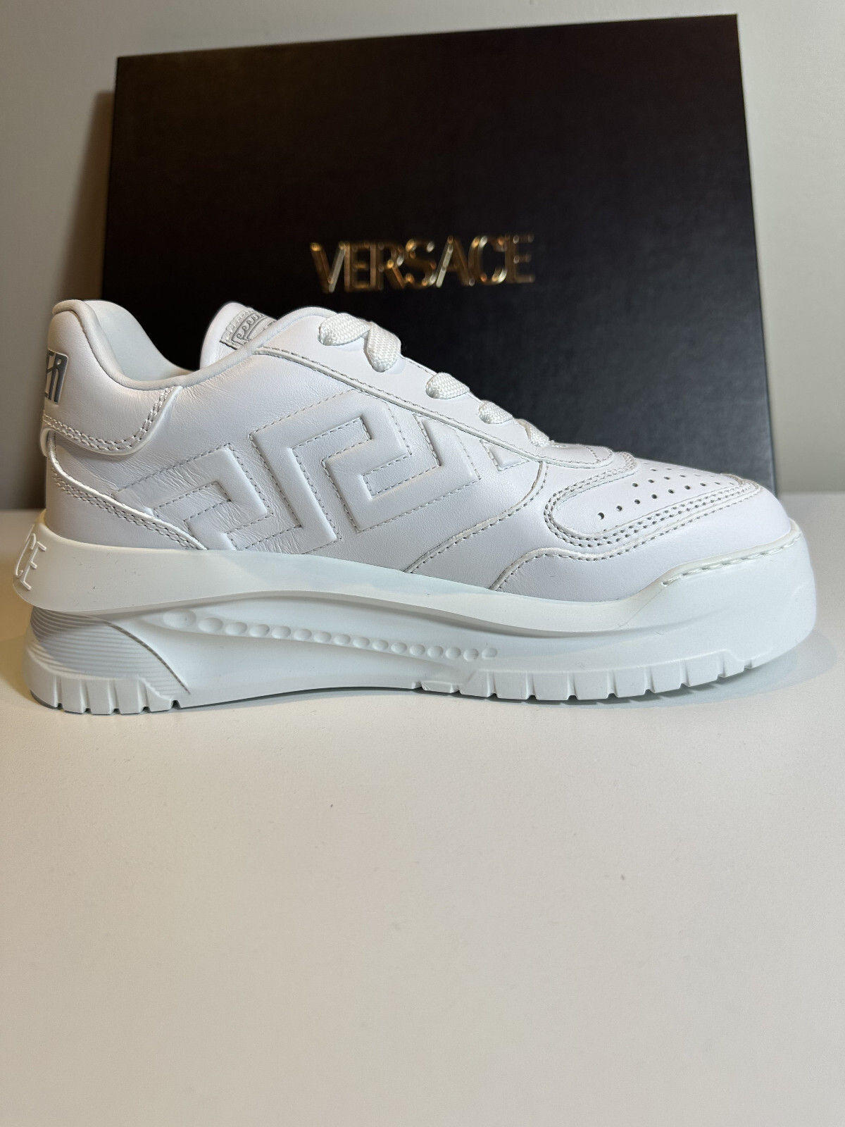 Brand new in box with tags 100% authentic Versace Model: Odissea Color: White Size: EU 38.5 / US 8.5 Material: Leather Includes: Original box, dustbag, and authenticity card Features: 3D Medusa embossed detailing, bold Versace branding on heel, futuristic chunky sole Made in Italy