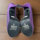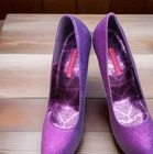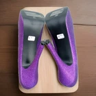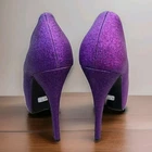 The NIB Bordello Collection Purple Glitter Ombre Sparkly Pumps are a stunning pair of high heels with a 5.75" stiletto heel and platform for added height and padded for comfort. These pumps feature a round toe shape and a striking ombre pattern with glitter accents, making them perfect for women who want to make a statement with their footwear. The synthetic upper material and standard shoe width offer durability and a comfortable fit, while the Bordello brand ensures quality and style. Perfect for any season, these sparkly purple pumps are sure to add a touch of glamour to any outfit. Purple Glitter Ombre Bootie Covers also included. Please refer to pictures for condition details.